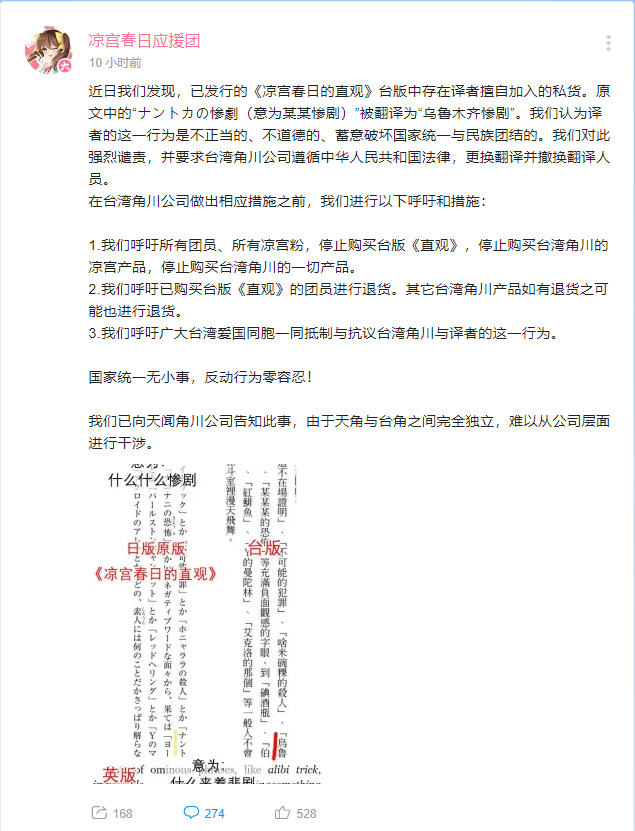 但未料,才剛發售沒多久,卻傳出了《涼宮春日的直覺》台版小說疑似因用詞不正確,而遭中國網友指控台灣角川涉嫌辱華疑慮。