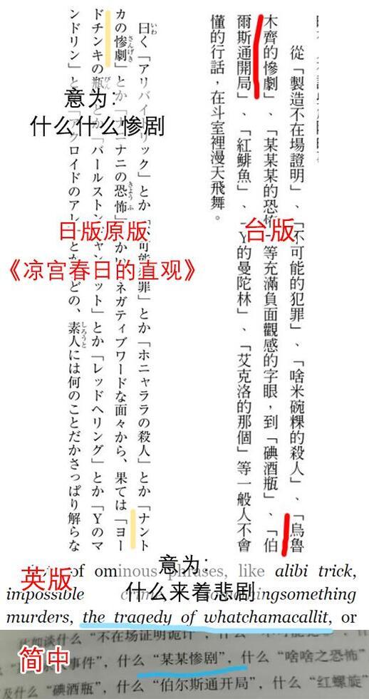 根據「凉宫春日应援团」社群的某一中國網友於彈幕網站bilibili動態欄發文指出,小說原文中的「ナントカの惨劇」意為某某慘劇,但在台灣卻被翻譯成「烏魯木齊慘劇」,因此被指控為是蓄意破壞國家統一與民族團結,要求台灣角川遵循中國法律,撤換翻譯並更換翻譯人員。
