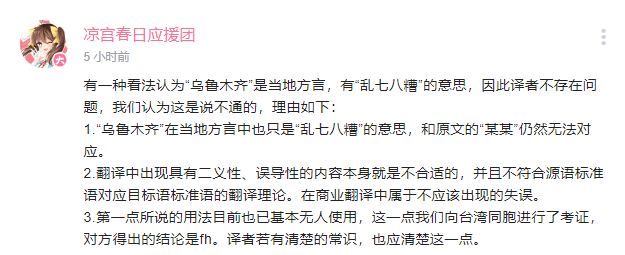 事實上,在台灣「烏魯木齊」(台語:oo-lóo-bo̍k-tsè),通常指的是胡說八道、亂七八糟的事物,不過中國網友則認為,這樣的意思與原文中所表達的語意依然完全不相符,為此更主張指出台灣角川的翻譯具有嚴重誤導性,論及商業更是屬於不應該出現的失誤。