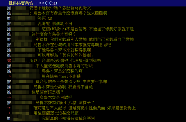 所以各位電電小夥伴認為「ナントカの惨劇」被翻譯為台語的「烏魯木齊的慘劇」是正確,還是誤導性呢?不過讓小編最為訝異的是,似乎真的年輕一輩都不太曉得「烏魯木齊」 的意思了...