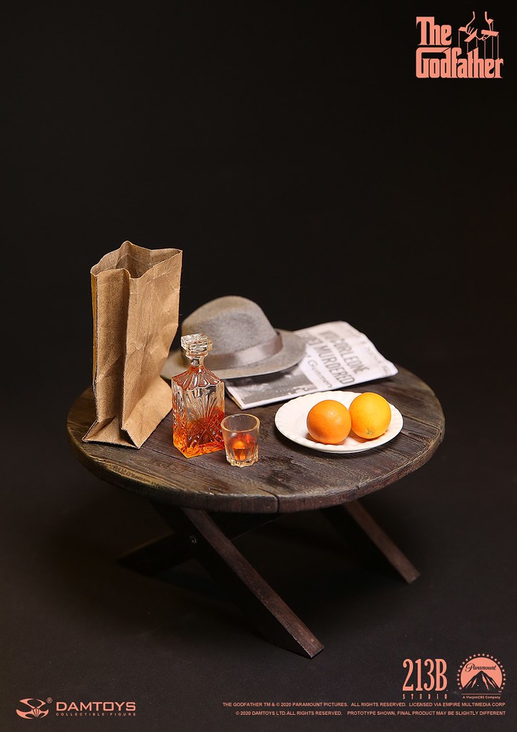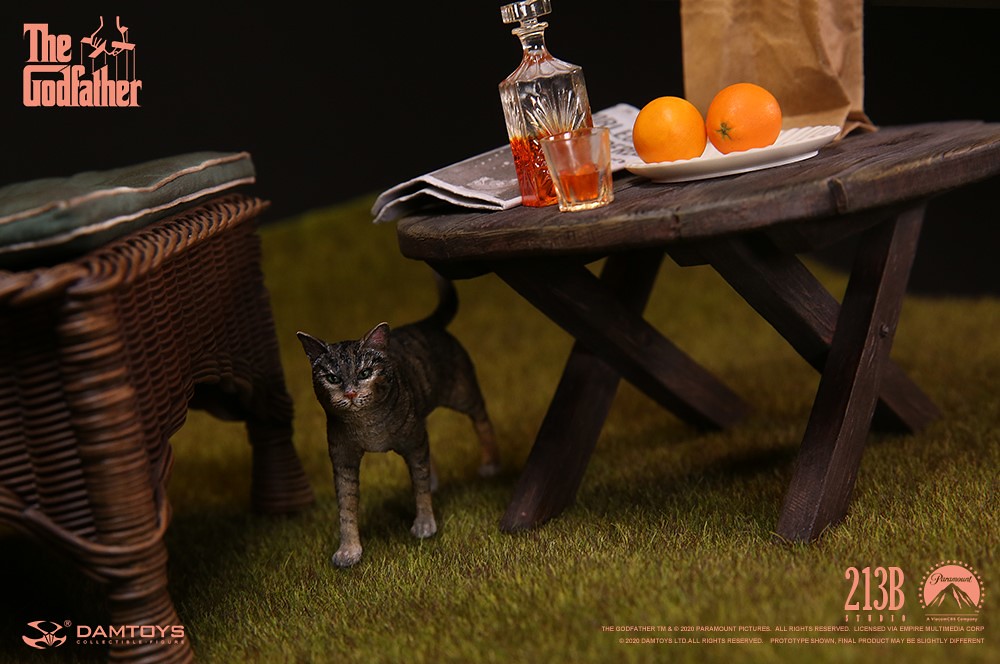 對比之前 DAMTOYS 推出的身穿黑色西裝的正式版(Formal Version),這次「流金歲月」的版本採用維托·柯里昂一身灰色套裝的造型,而且還追加了一顆閉目養神面貌的頭雕,加上紙袋、橘子,以及就能還原他在街頭遭到槍擊的造型,另外,本作還附上了毛衣、威士忌酒瓶&Shot杯、盤子、維托·柯里昂遭到槍擊的頭條報紙、休閒座椅、圓形茶几、貓咪......等豐富配件,讓各位玩具人可以展現出與正式版本不一樣風格的維托·柯里昂!