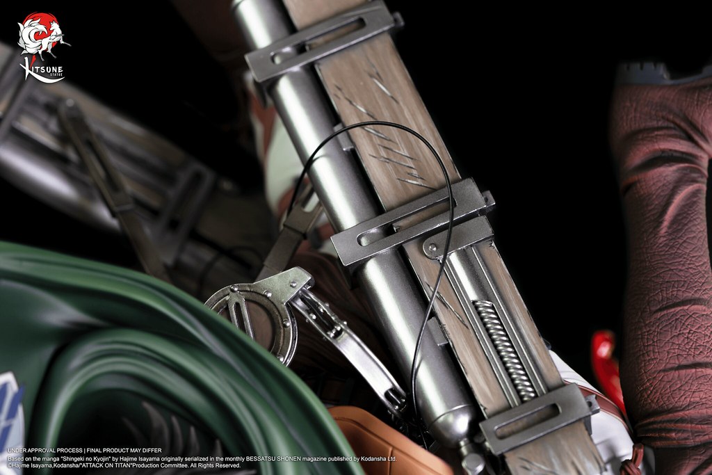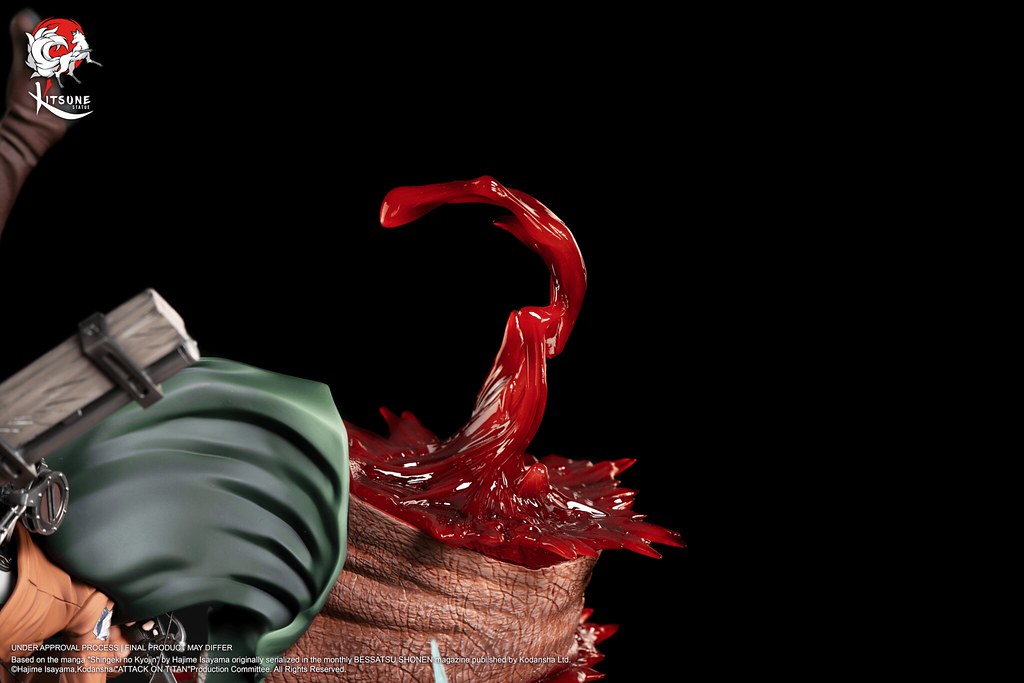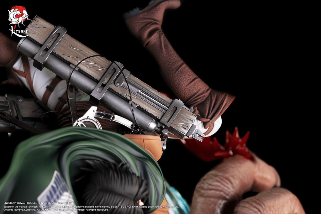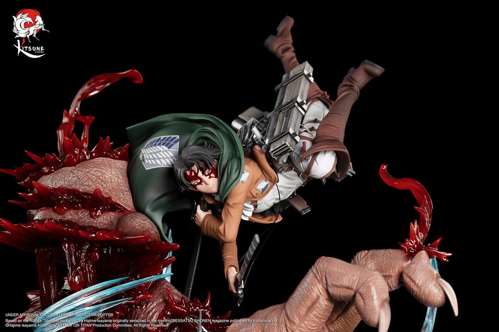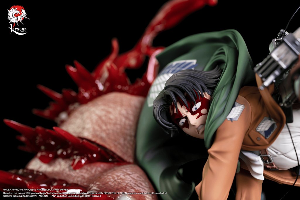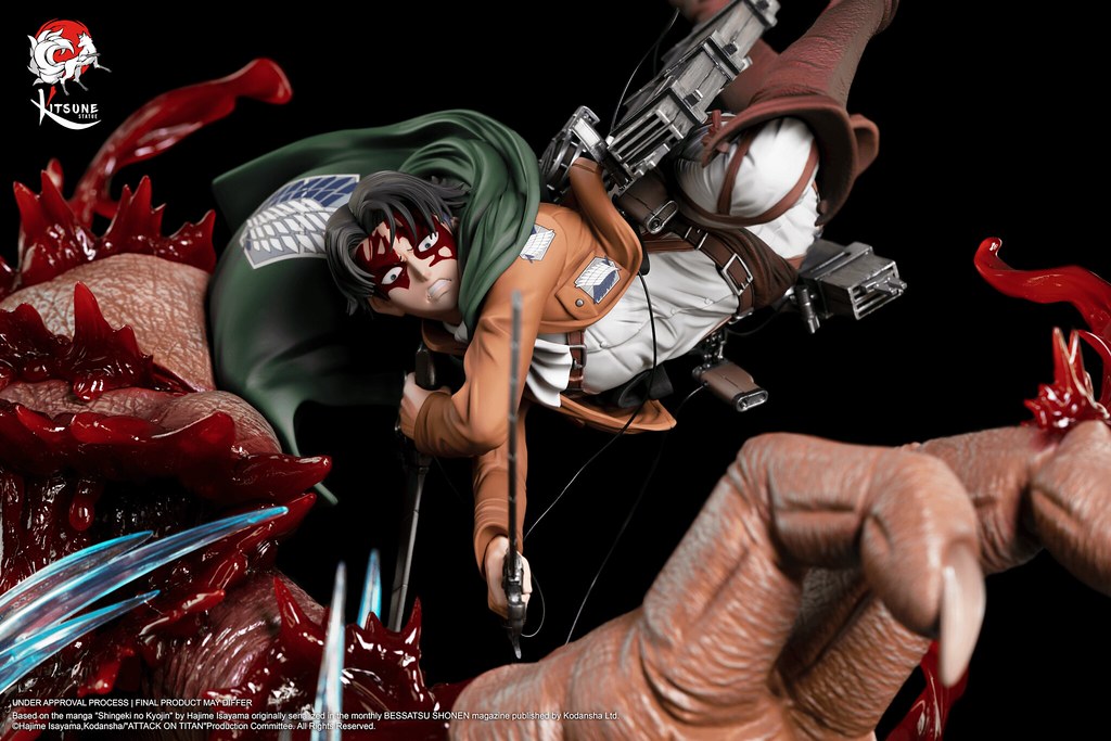 「里維 VS 野獸巨人」1/6比例雕像,將調查兵團的兵長里維與獸之巨人的戰鬥畫面立體化呈現,還原在瑪利亞之牆奪還行動時,成功靠近野獸巨人,並將之巨人化型態擊敗的場景。尺寸約為高45 × 寬34 × 深31 公分,整體散發出來里維的靈巧的身手以及強大的憤怒!精緻的服裝細節與複雜的立體機動裝置皆仔細打造,並施以質感的塗裝展現氣勢;帶著血跡的頭雕,共有冷酷、憤怒咬牙兩款表情。穿梭在巨人絨毛又巨大的手掌之間,並將手指俐落砍斷,不讓野獸巨人以手保護自己的後頸,四處漸出透明材質打造的鮮血,充滿血腥與狂暴的氛圍,更傳達了兵長堅定貫徹意志的不屈精神!