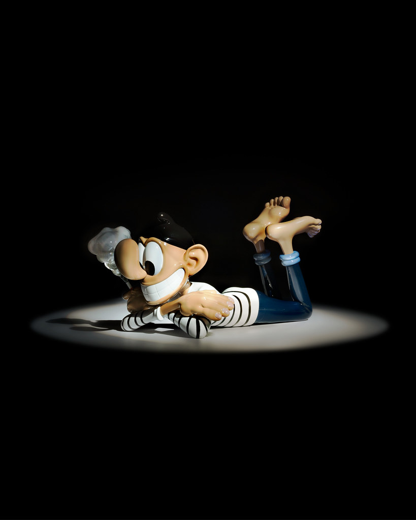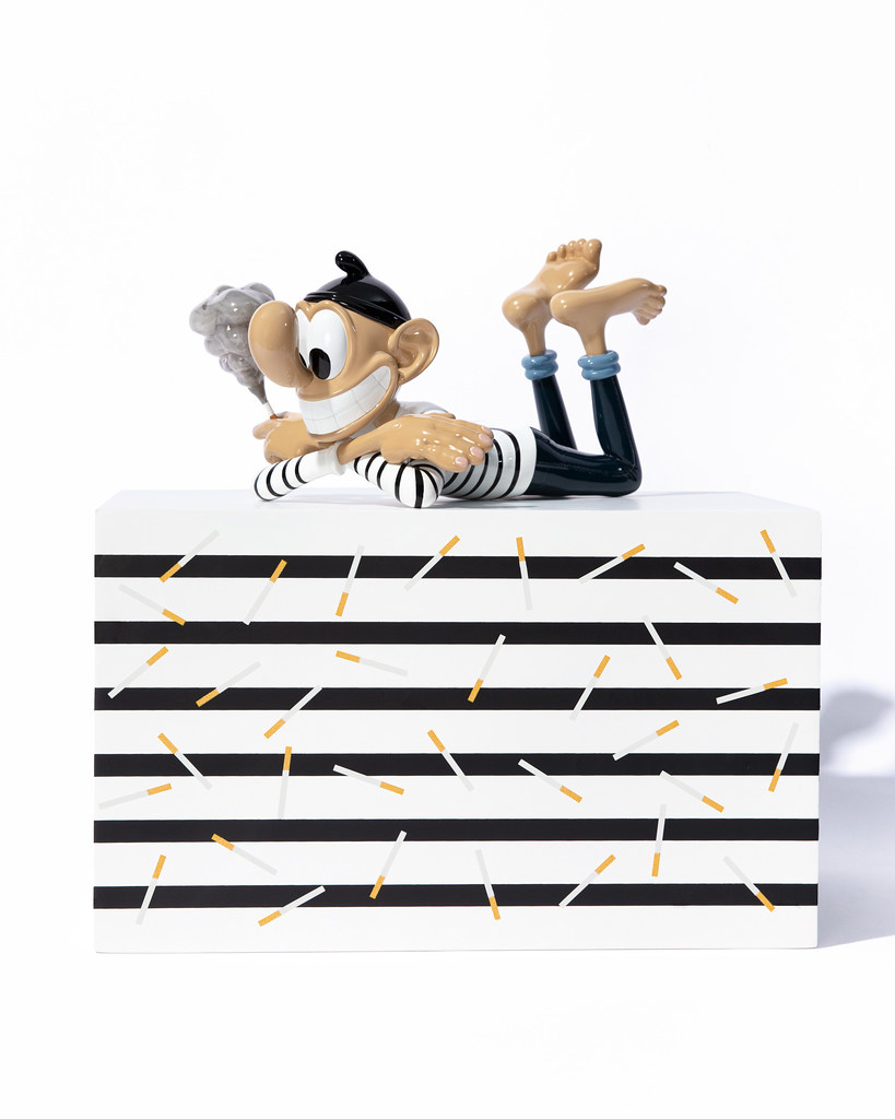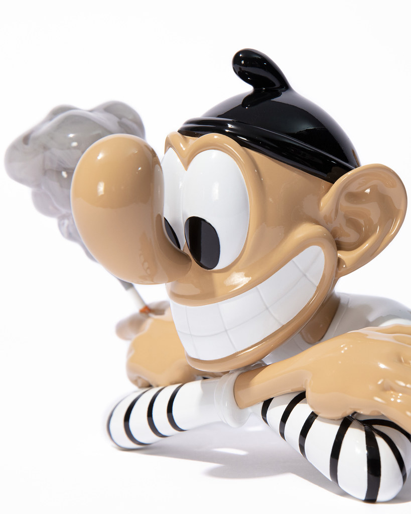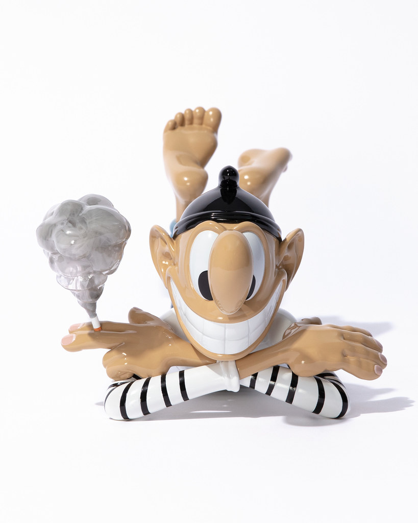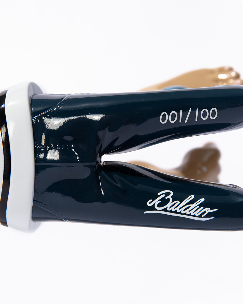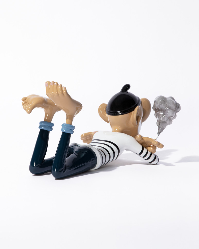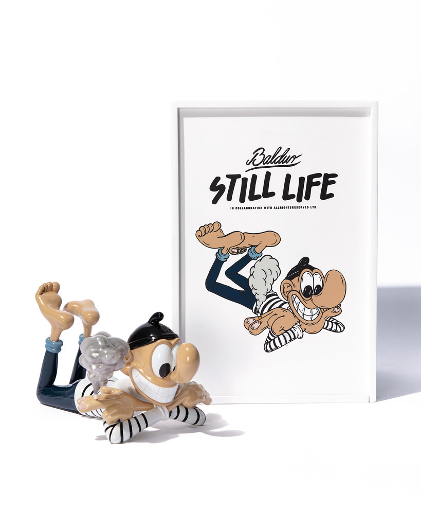 本次的雕塑作品「STILL LIFE」尺寸為高 14.7 × 寬 18 × 深 28.5 公分,將這位身穿條紋的大鼻子角色以雙手交叉的悠閒趴姿呈現,除了極具份量的卡通鼻,微笑的嘴巴、手掌、腳掌也都被刻意地放大,充分還原 Baldur 筆下的角色神韻,從香菸瀰漫開來的灰煙也展現了如同真實煙霧被鎖住的樣貌,視覺效果十分驚人,而在本作的雙腿,還有簽名與限量編號,包裝盒的盒繪也很讚呀!