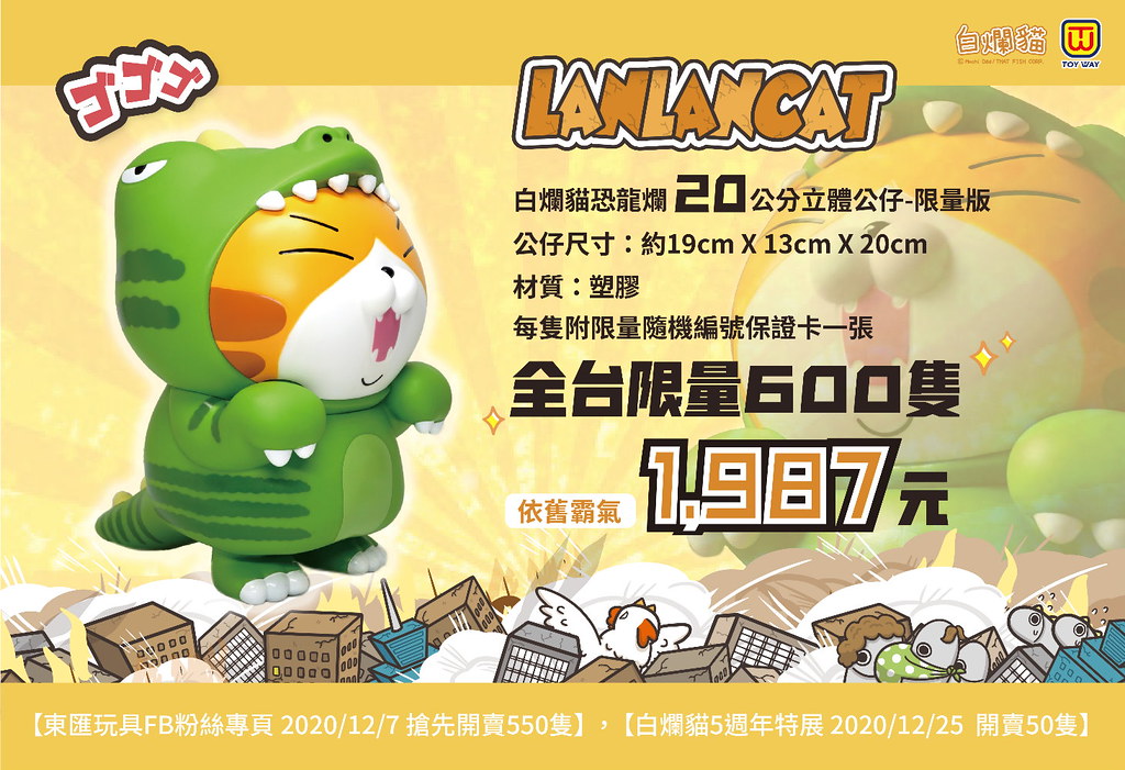 白爛貓-恐龍爛20公分立體公仔-限量版