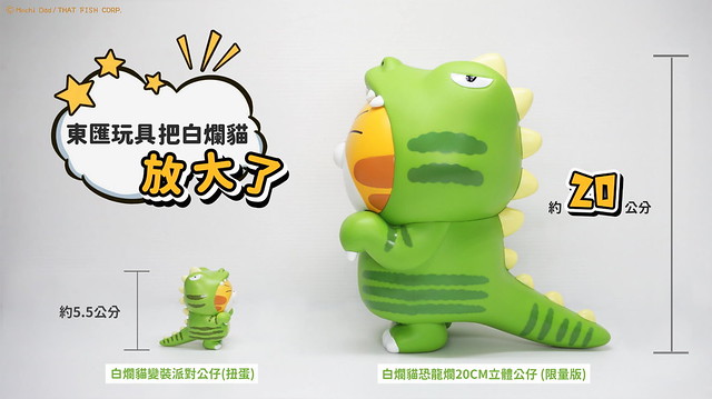 精選熱銷扭蛋《白爛貓變裝派對》中,獲得爛粉們最多迴響的「恐龍爛」這次將扭蛋版約5.5公分尺寸,放大到20公分立體大公仔!!巨大化的恐龍爛,更肥厚、更霸氣! 手感、質感大躍進!