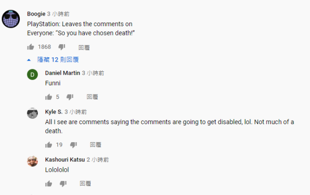 「Playstation很快會封鎖玩家留言功能」、「這部預告的意義是什麼?」、「預告片爆雷所有故事的重點」,而最大的熱門炎上言論則是迷因諷刺:「SO YOU HAVE CHOSEN DEATH.」,充斥著玩家對該遊戲的不滿。
