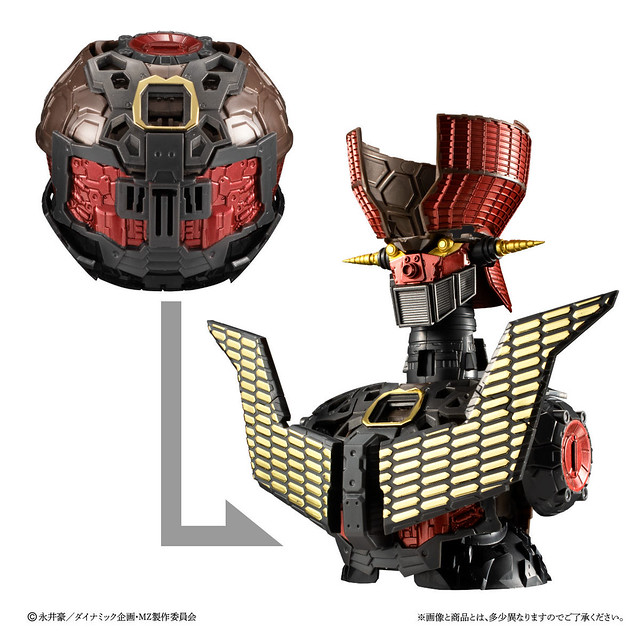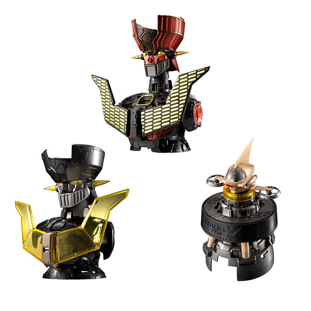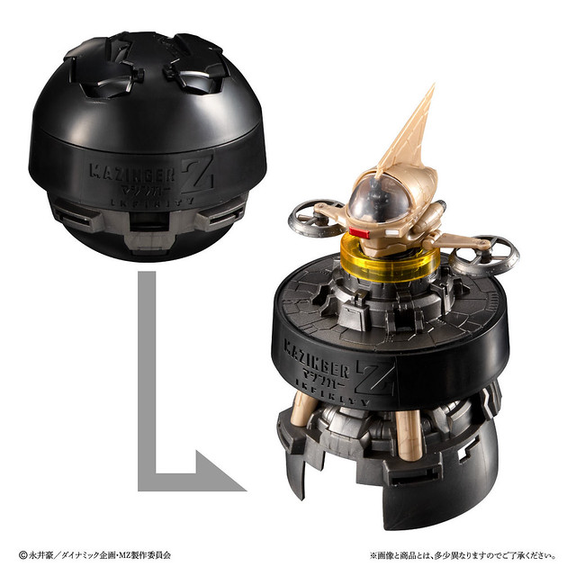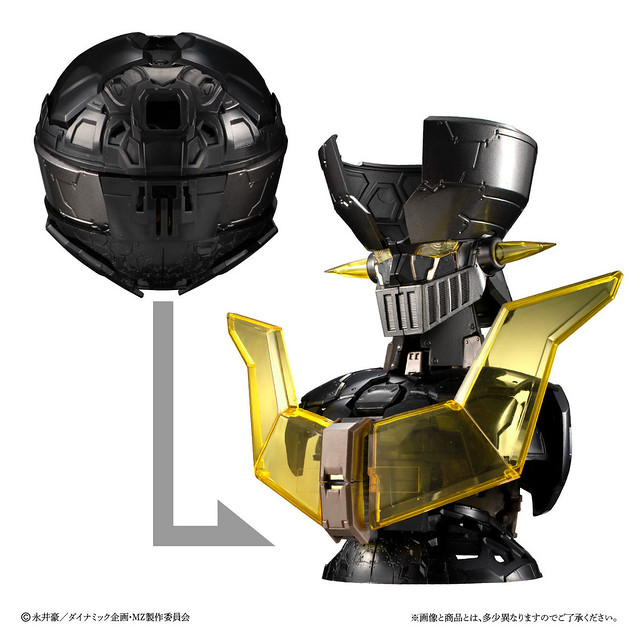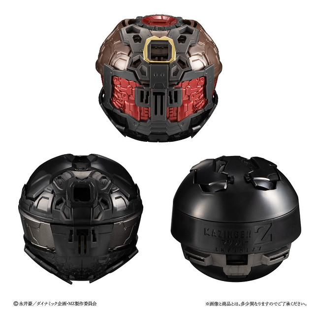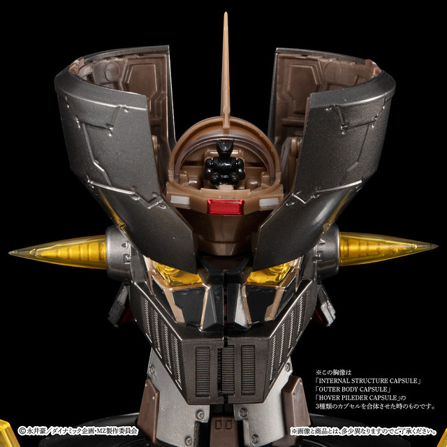 顏色改變,魄力依舊滿點!本款「INTEGRATE MODEL 無敵鐵金剛」黑色版胸像,結構與之前推出的普通版和原色版皆相同,以全新開發之「轉蛋骨架構造」結合轉蛋蛋體本身和組裝零件,將胸像所有零件分為骨架「內部構造」(インターナルストラクチャーカプセル)、裝甲「外部機身」(アウターボディカプセル)與「迴旋指揮艇」(ホバーパイルダーカプセル)三顆轉蛋,整體組合時高度有 20 公分!並且可以依照自己喜好,要選擇以怎樣的方式擺設,不論是組合、或是個別,甚至是露出半身機械內部結構的方式等等,整體色澤走黑與金之搭配為主視覺,與前兩款有截然不同之樣貌!