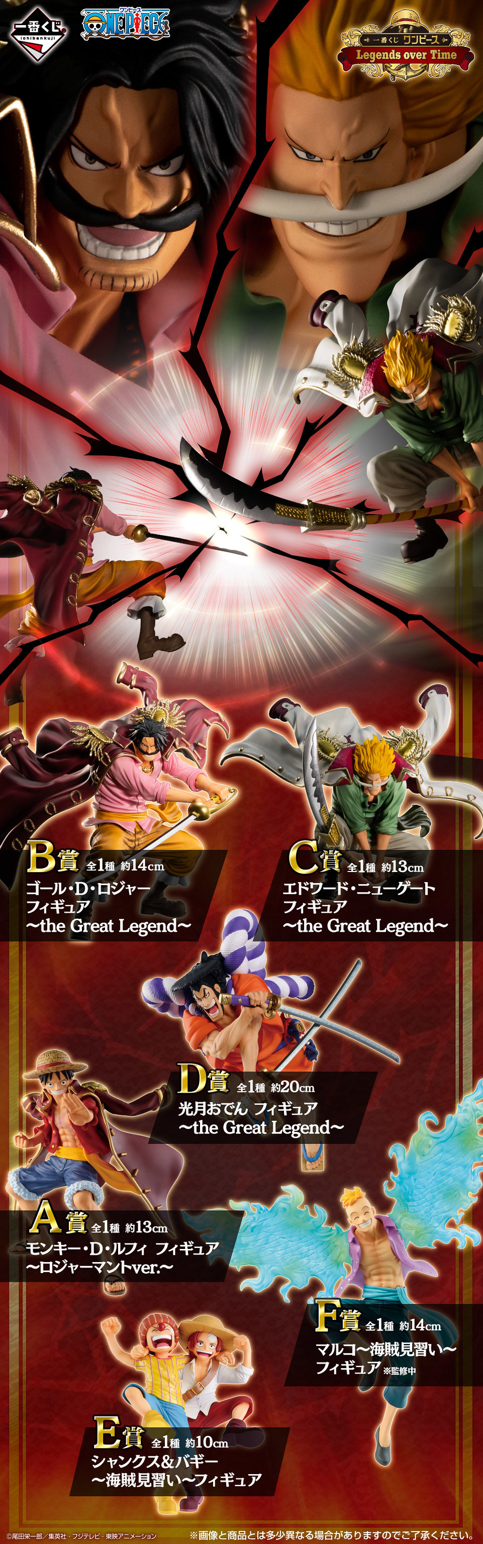 在大海賊時代揭開序幕之前,早就有強悍的豪傑們在海上激烈戰鬥,而他們的故事也以口耳相傳的方式永遠留下,這次的「Legends over Time」可說是滿足了海賊粉絲對於傳說大海賊們的嚮往,收錄有魯夫、海賊王「哥爾·D·羅傑」、白鬍子「艾德華·紐蓋特」、和之國將軍繼承人「光月御田」、見習時期的「不死鳥馬可」(監修中),以及同樣是海賊見習生造型、菜雞模樣的「巴奇」&「傑克」,羅傑與白鬍子是以霸氣對撞的魄力身姿呈現,將兩者湊齊收藏更具觀賞價值!目前除了 A~F 獎角色模型(高約 10~20 公分)的圖片之外,還有各獎項的文字情報,不過,最後賞目前尚未公佈。