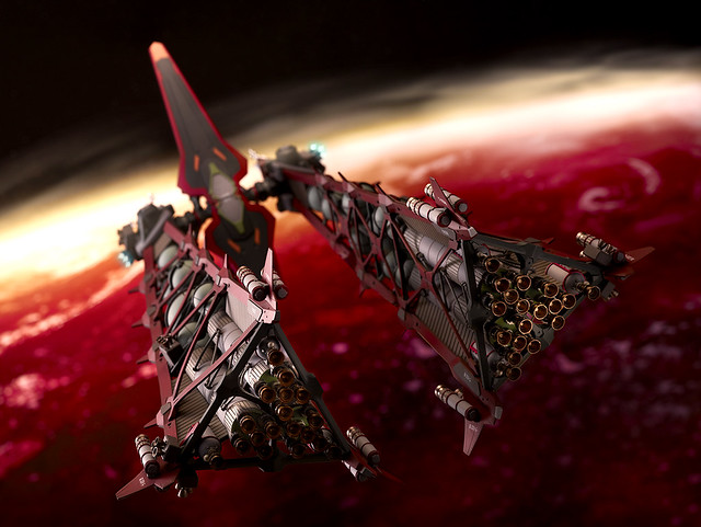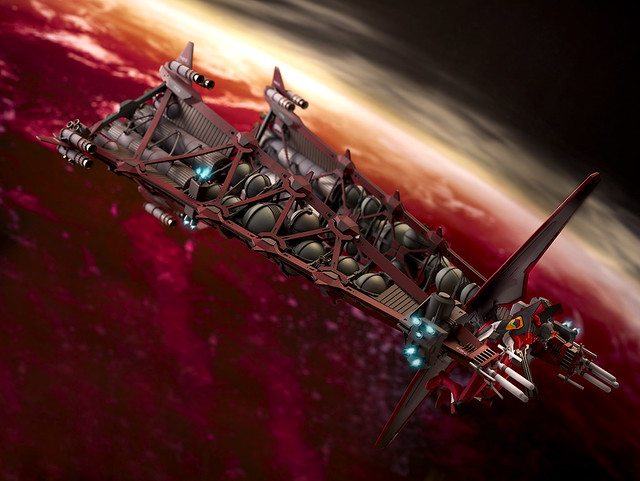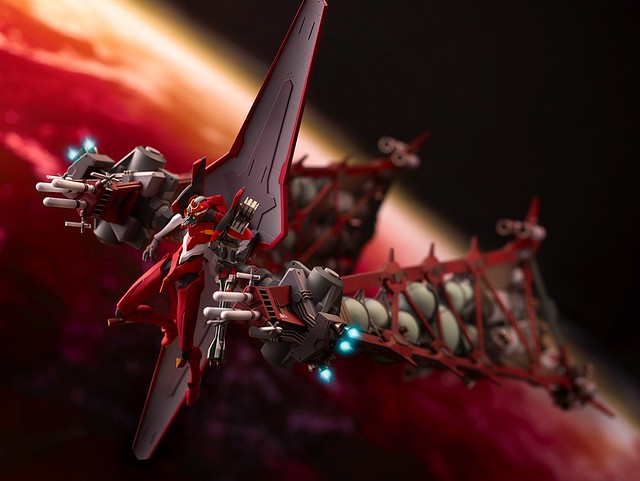 「EVANGELION 改2號機β[推進器裝備]」為全長約 32 公分的塗裝完成品模型,雖並非大比例作品卻高度再現精密的細節造型。從試作品中可以看見,最前端的 EVA 改2號機β 製作出右臉部、左臂繩索槍等不對稱細節,背部則有尺寸魄力的大型盾牌與推進器,將外部桁架、內部球形燃料槽、尾端結構複雜的大量推進器徹底再現,份量讓人感到滿足。