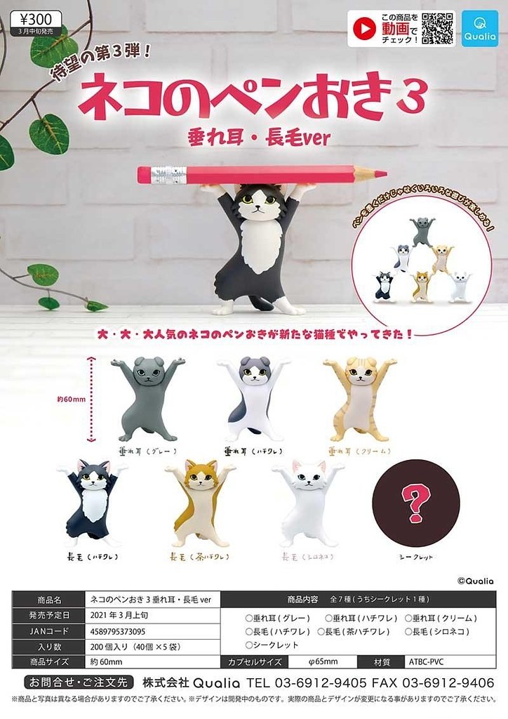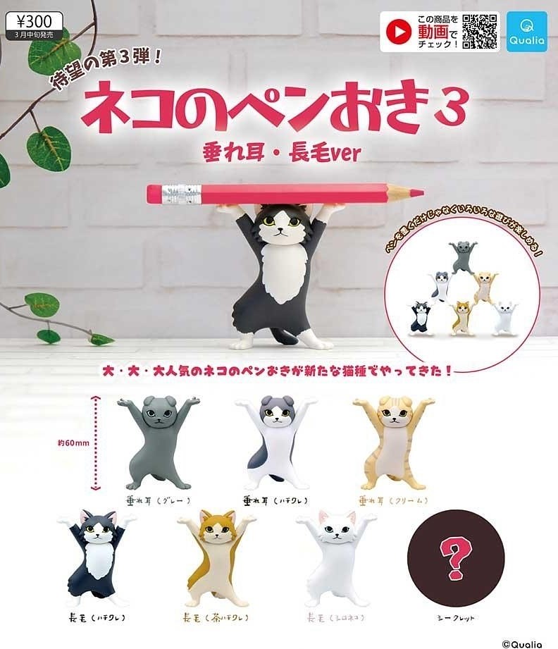 日本趣味轉蛋公司Qualia(株式会社クオリア)推出的搞笑作品「貓咪置筆架」、「貓咪置筆架 2」轉蛋後,無所不扛的奇妙姿勢貓咪將再度襲來,第三彈「貓咪置筆架 3 垂耳/長毛ver.」也緊接著登場啦!一共有七種款式,參考售價為一轉 300 日圓,預計 2021 年 03 月發售。