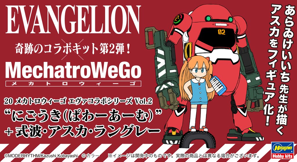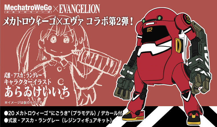 通常是以 1/35 的比例製作,稱為「35 Mechatro WeGo」,曾經作為模型製作者參與過《新世紀福音戰士新劇場版》小林和史,先前推出過初號機配色版,此次再度與《新世紀福音戰士》合作,推出 1/20 比例稱的「20 Mechatro WeGo EVA」,夢幻合作的第二彈以「貳號機+式波·明日香·蘭格雷」為主題,結合新二號機的設計,採用「機械動力手臂」版本的造型!另外,附屬的小學生版明日香,除了站在公園輪胎上,手上還拿著口風琴樂器,可以與第一彈拿著響板的小綾波合奏!