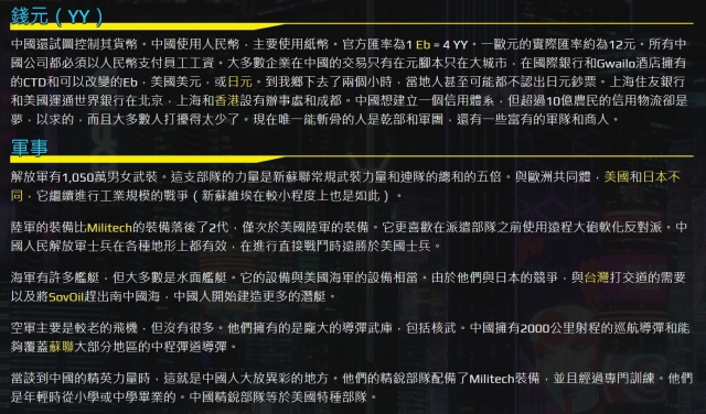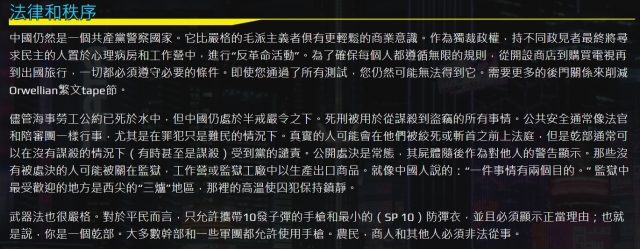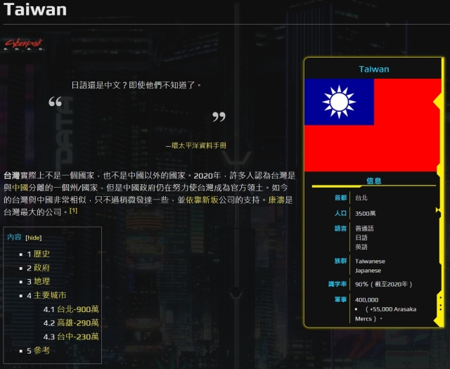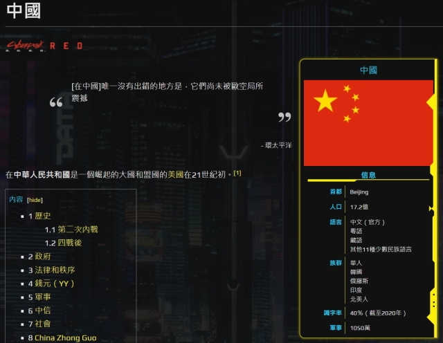 而在Cyberpunk Wiki的「中國」頁面上卻有著更勁爆的內容,他們不僅將一些許多國家跟遊戲廠商都不敢觸碰的中國政治內幕說出來,甚至還在內文說了「中國仍然是一個共產黨警察國家。它比嚴格的毛派主義者俱有更輕鬆的商業意識。作為獨裁政權,持不同政見者最終將尋求民主的人置於精神病房和勞改營中,進行“反革命活動”。」並且表示在這個世界觀之中,中國這個國家整體人民的識字率是 40% ,遠遠比台灣的 90% 還要低上不少,可以說是被間接定義為識字率低於 55% 的文盲國家!?讓不少網友質疑這疑似有辱華嫌疑。