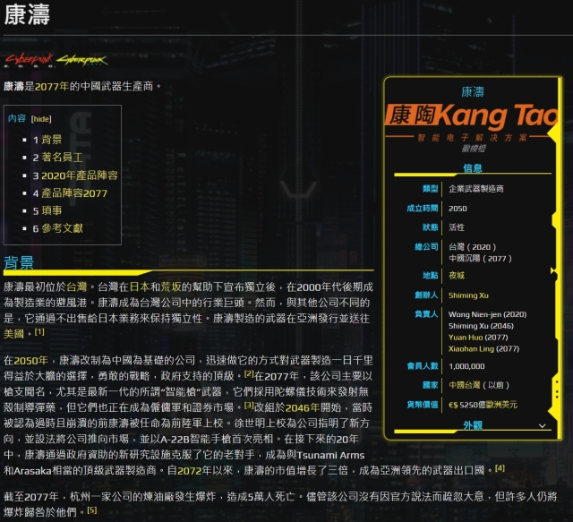 在《電馭叛客2077》的世界觀裡面,台灣並不是一個完整的國家,但也絕對不是屬於中國的,而如今的台灣與中國非常相似,只不過稍微發達一些,而在台灣創業的公司「康濤」的Cyberpunk Wiki頁面上卻寫著「台灣在日本和荒坂的幫助下宣布獨立後,在2000年代後期成為製造業的避風港。」這段話,讓許多台灣玩家看到後表示興奮且一定會支持這款遊戲。