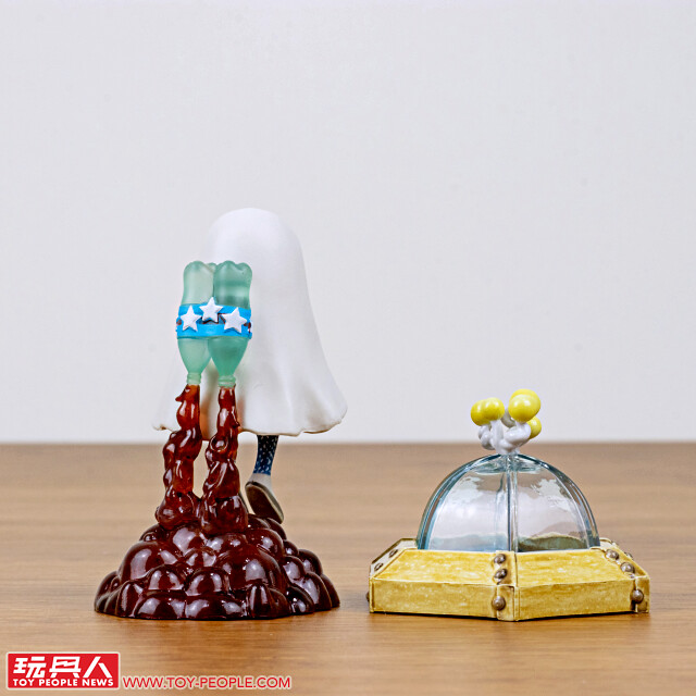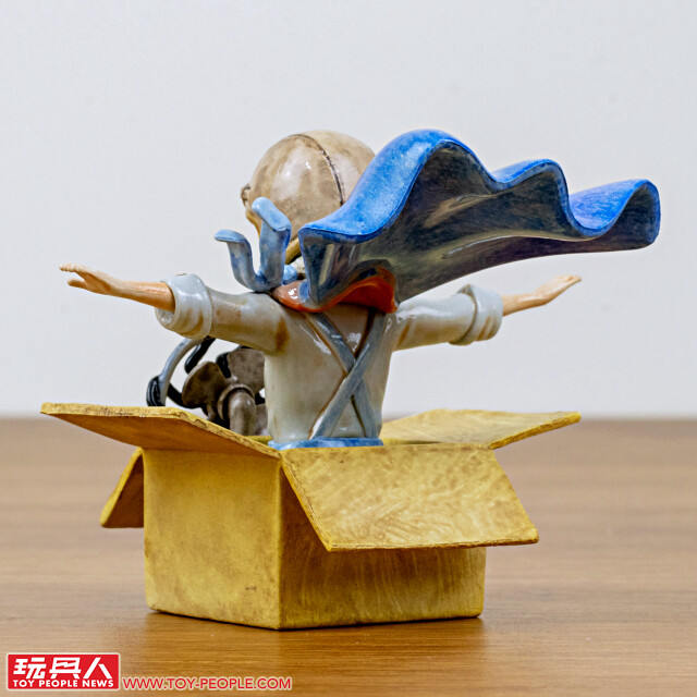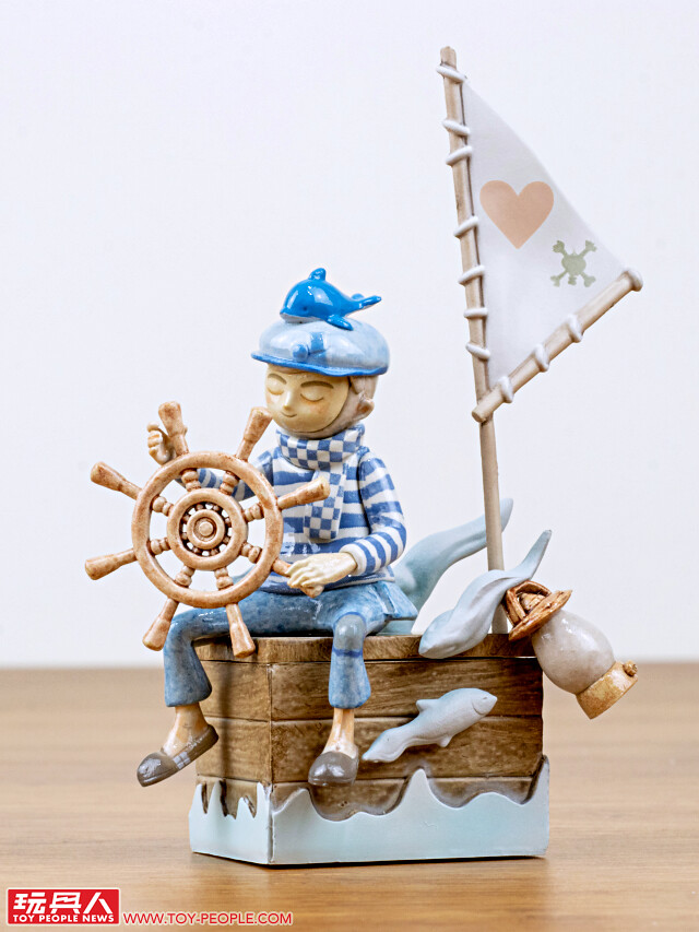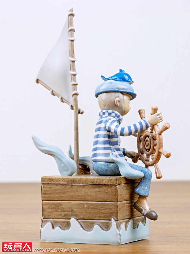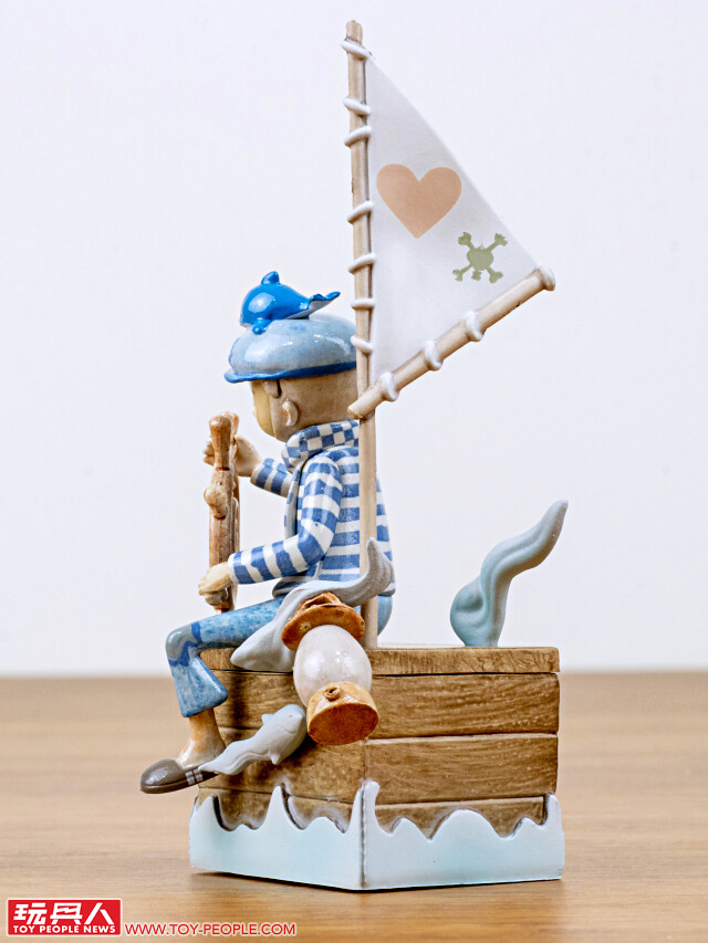 即使沒有船,只要在木箱上插著旗幟、雙手轉動船舵,就彷彿在大海上航行一樣!阿pi 一身藍色的服裝,搭配閉上眼睛的造型,散發出一種平靜、療癒的氛圍~帽子上的鯨魚、格紋圍巾都有夠可愛,抽到這款的玩具人是否發現了木箱裡的暗藏玄機呢??