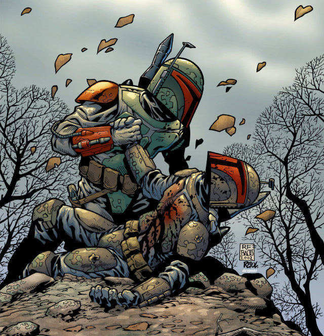 之後取回了盔甲的波巴費特更是如同鬼神般,可注意到他將槍收回槍套前,有做出一個耍槍的旋轉動作,這個也是傳承自他的父親強格(同演員),於第二部曲《複製人全面進攻》的吉諾西斯競技場,強格費特射死一位絕地大師時就有同樣的習慣動作。波巴費特將逃走的帝國運輸艇一箭雙鵰後說「我其實是瞄準另一艘」的搞笑台詞,疑似是致敬經典西部電影《豪勇七蛟龍》(The Magnificent Seven,1960),劇中有段情節是遠距離射中了騎馬的人,當下對話是「那是我所見過最神準的射擊」「不,我其實是瞄準那匹馬」。