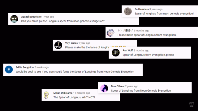 「MAN AT ARMS」團隊(取自中世紀盔甲戰騎)是一群熱衷還原冷兵器的狂人,主要在影片中拍攝他們為致敬電影、動漫,並打造代表性武器的過程,而這次他們在全世界粉絲許願下玩成《新世紀福音戰士》中能夠刺穿AT力場絕對領域,突破心之壁的破防武器「朗基努斯之槍」。
