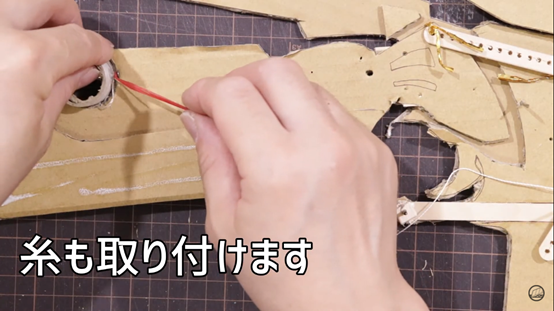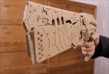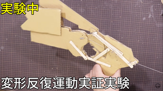 為了符合本作賣點,推主在幾個月前的更新影片中不斷試驗著如何用輪軸與細繩,研究使槍身變形來回切換,影片中詳細的製作過程可以看見當時還尚未雕琢外觀的樣貌,而推主用紙模完成的拉風護目鏡也很搶眼XD 甚至還有特別講解自己如何完成的影片。