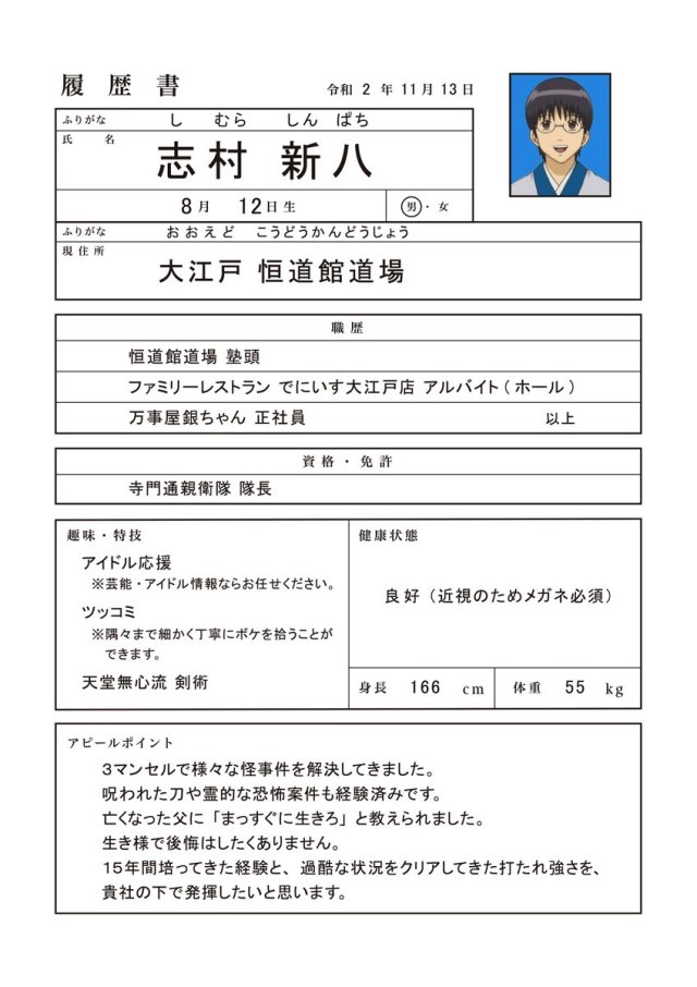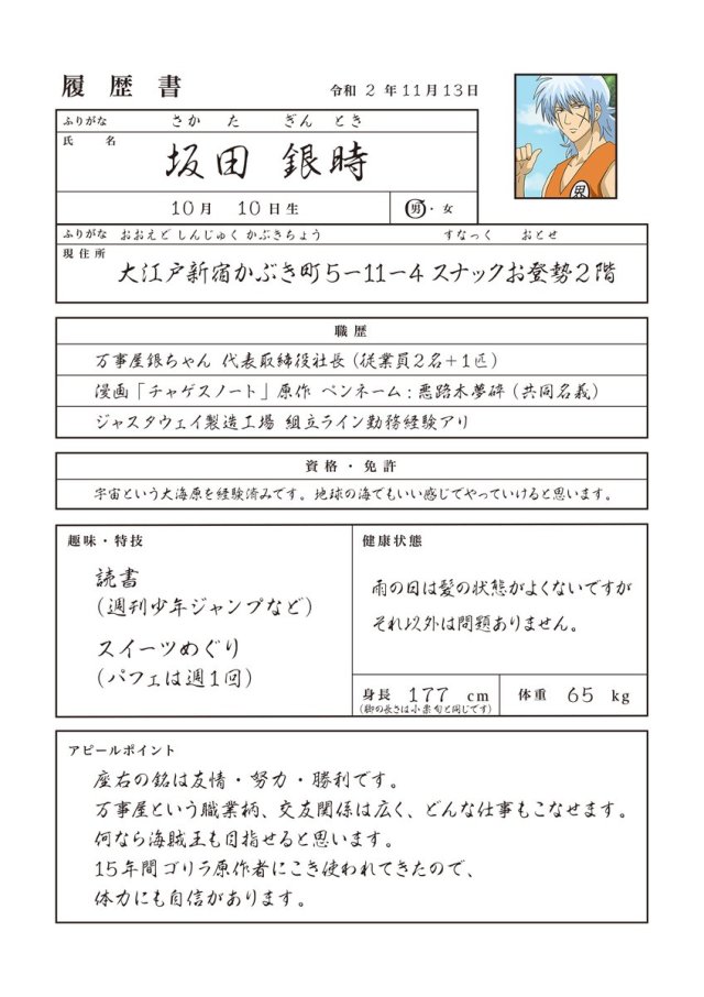可惡!這下子該怎麼辦呢?果然在這個時候還是先向幾家大公司投履歷才是最正確的事情吧!於是阿銀、新八跟神樂從11月底開始就不斷地投履歷,確保下一個工作有著落啊,只不過這種履歷真的有人肯用嗎…