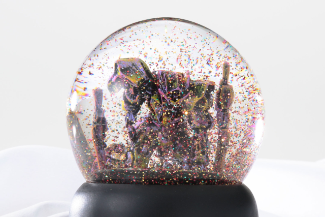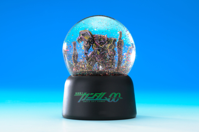 利用水晶球的效果,可以看到裡面的鋼彈 00 聳立著,與該幕同樣的姿勢,身邊包圍著繽紛的亮粉,試圖呈現出各種色澤的花朵包圍的經典一幕。透過水晶球擺飾的特性,有如花朵飄落一般,具有創意巧思。