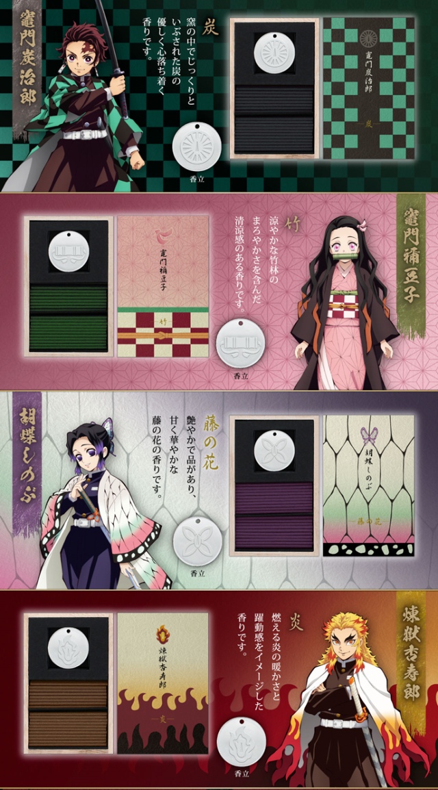 四位角色分別為竈門炭治郎、竈們禰豆子、胡蝶忍與煉獄杏壽郎。透過「株式會社日本香堂」日本天正時代傳承下來的薰香技術,幾百年來的工藝打造出傳統且具有匠心工藝的線香產品。