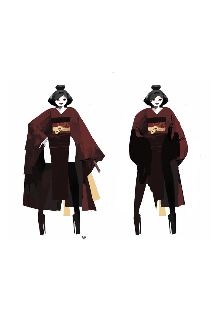 原畫設定 Ashley Wood 運用紅黑強烈對比,抹上一息壓抑氛圍,更在表情上放大了怨靈的瘋狂,美人一笑攝魂奪魄,肢體展現上並沒有東方女子纖細的刻板印象,而是充滿殺手的力度與線條。