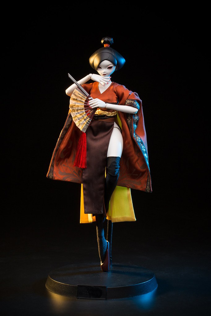 【紅蝶 GEISHA】人偶化後,採用由 Ashley Wood 全新設計的UV女性素體,高約 32 cm,含 28 處可動關節,穿著精良剪裁和服,搭配附帶了多種可替換手型與豐富的配件,包括紅蝶般若相頭雕,換上之後殺氣爆表!