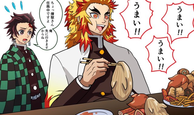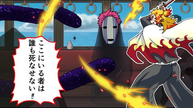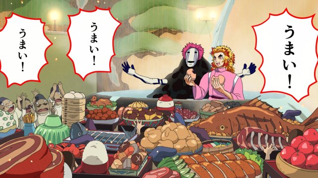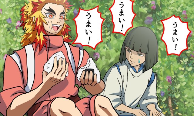 也因此,日本就有位繪師まろやか倫太郎(@rintaro_maro)畫出了「當炎柱穿越到《神隱少女》的世界時」的種種畫面,包含電影一開始吃著腔棘魚胃袋的場景,以及被湯婆婆改名的經典橋段都被畫進去了。