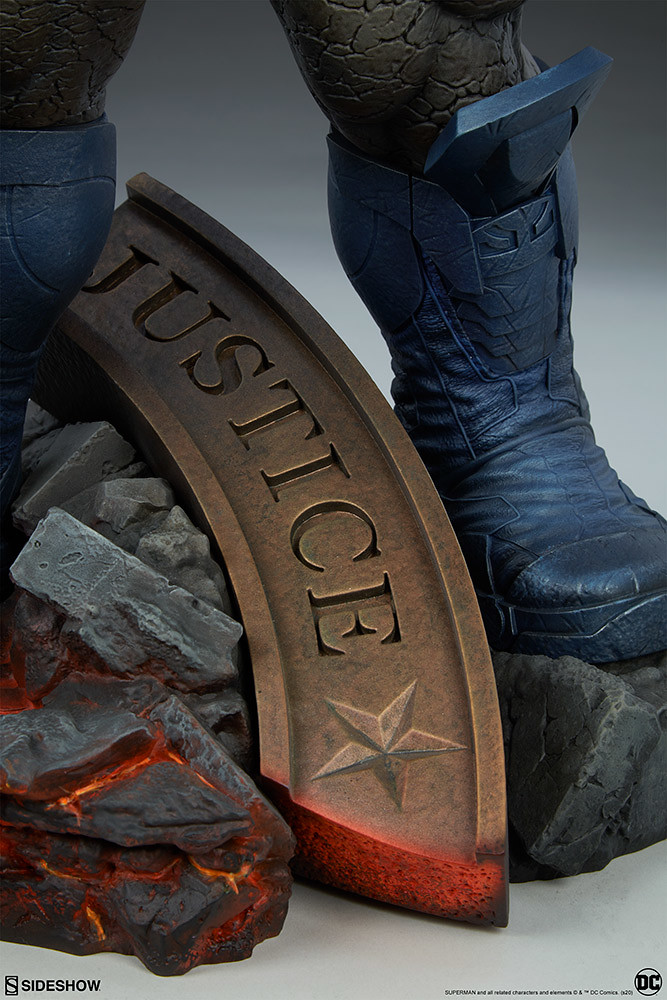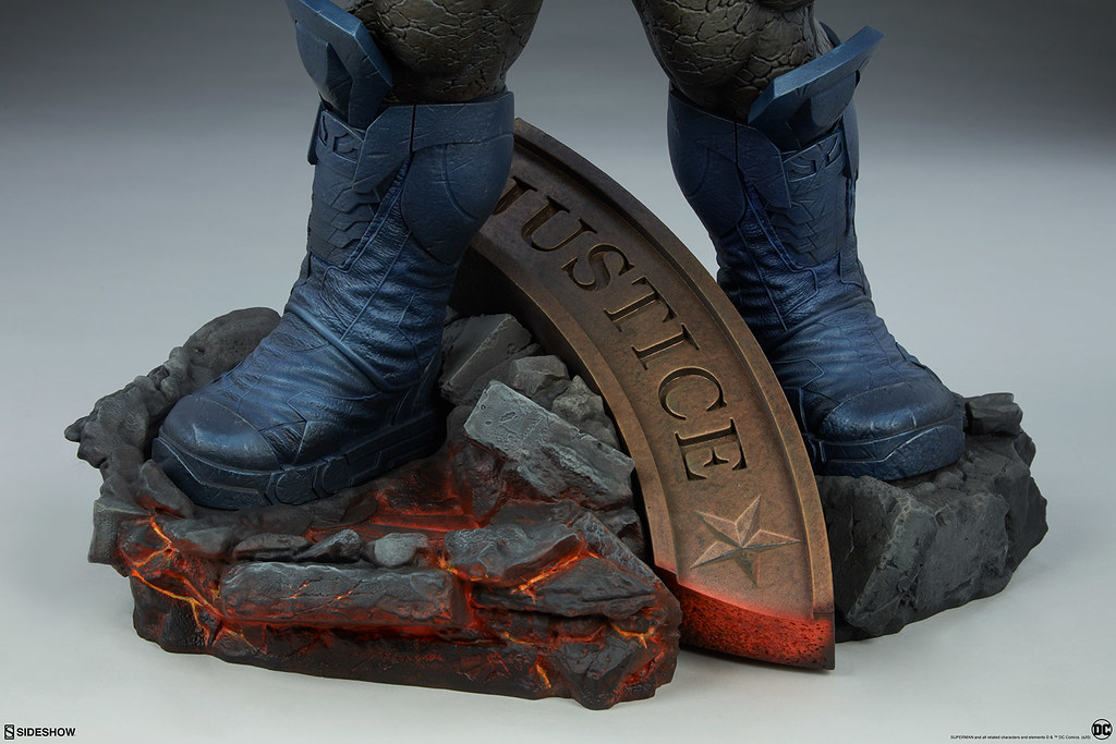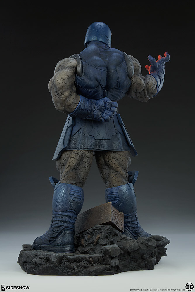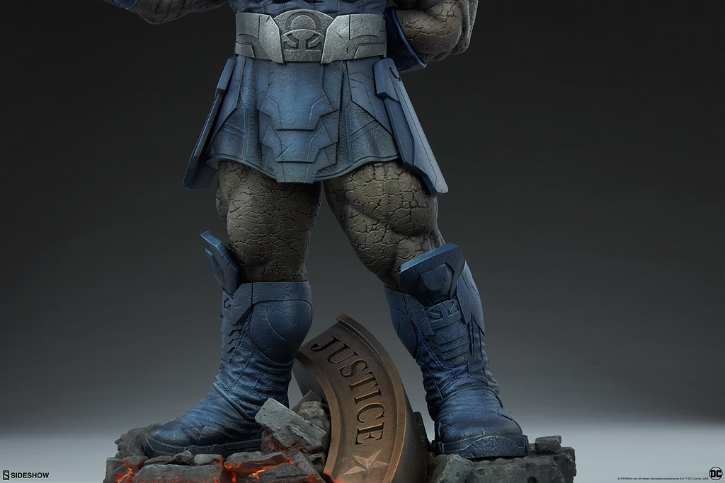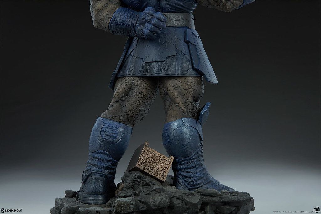 這一款最新的「達克賽德」雕像全高來到 60.9 公分,整體造型是根據 DC 的 New Gods 漫畫設定為基礎設計,呈現出準備發動攻擊的姿態,達克賽德腳底下還踩著正義聯盟基地的建築殘骸,搭配那個兇狠的咬牙神情,看起來極具魄力!藍色的頭盔、戰甲刻畫出逼真的舊化痕跡與深刻的肌肉形狀,臉部,裸露在外的手臂與雙腿更細膩地表現出符合其岩石巨人設定的堅硬體表,有趣的是,在右手還施以紅光的漸層塗裝,很有能力發動瞬間的臨場感。