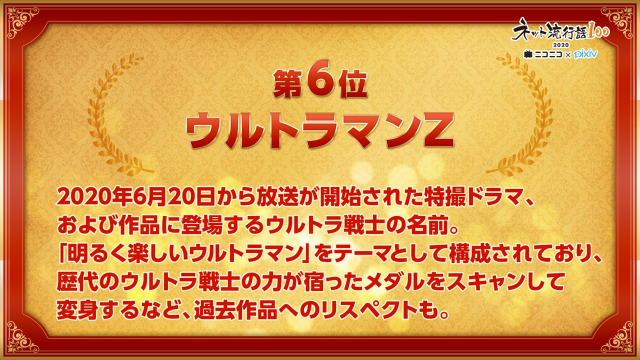 12月15日,由「股份有限公司dawngo」與「pixiv股份有限公司」聯合舉辦的「2020網路流行語100」的結果已經出爐,不知各位有沒有對這結果感到滿意,對於特攝迷我想是相當滿意的,本次依然有許多特攝相關名詞獲選其中,而令和第二位超人力霸王「Z」更是獲得了第六名的成績。