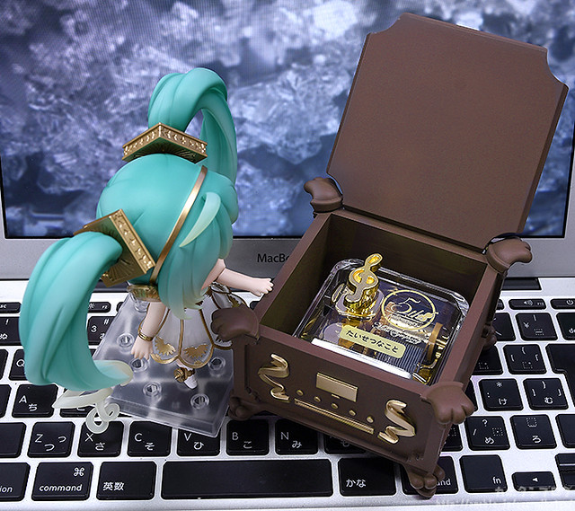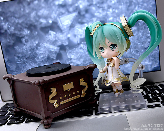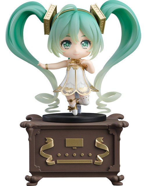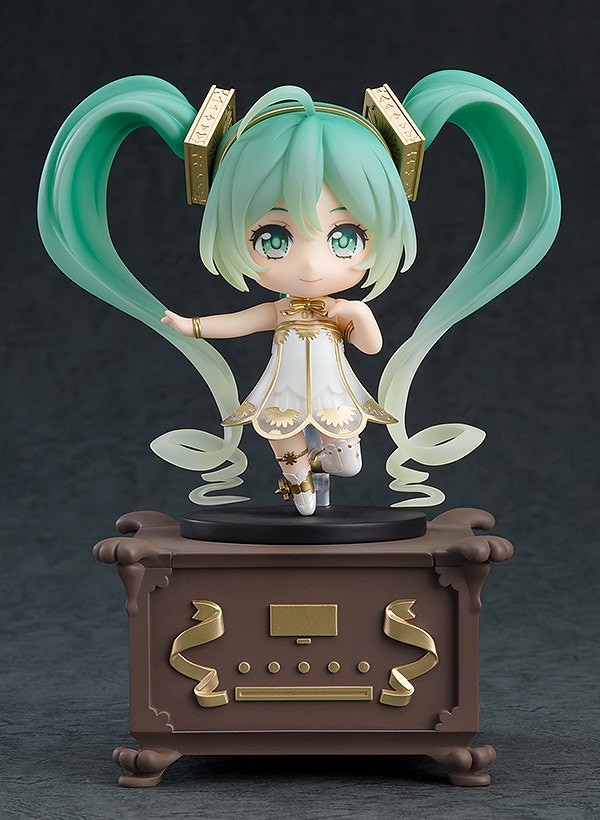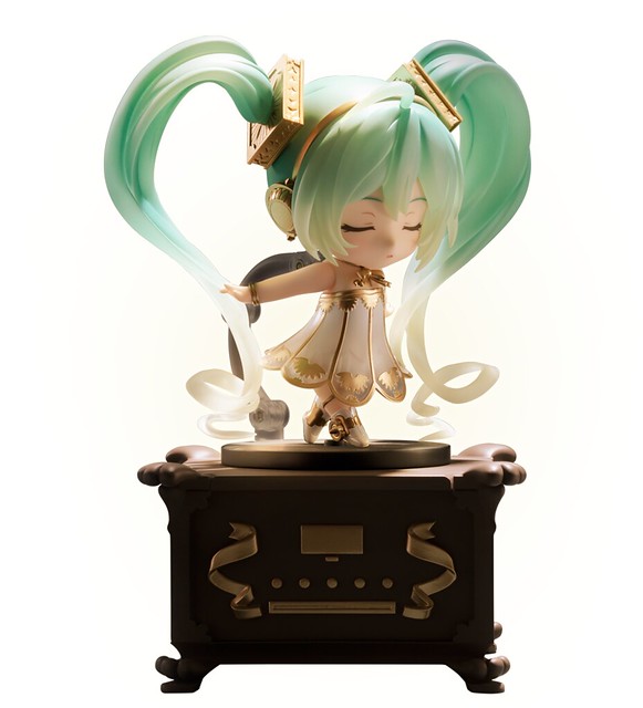 以繪師 Rella 繪製的主視覺圖為設計,將主視覺圖中奇幻而美麗的初音化身為嬌小可愛的 Q 版黏土人造型!繪師 Rella 以復古風的古典留聲機為靈感,設計了這次華麗而優雅的服裝。在透明質感的禮服上滾上低調奢華的金邊,藉此表現出流行的 Vocaloid 名曲以管弦樂隊演奏初音未來交響樂,呈現出有如在唱盤上旋轉舞動的樂之精靈~