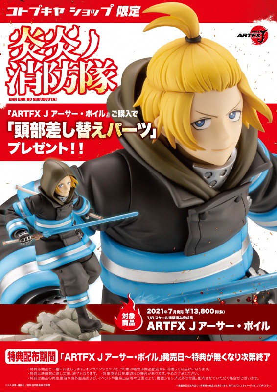 「ARTFX J 亞瑟·波義耳」1/8比例模型,尺寸全高約 205 mm,以漫畫第二集封面作為設計靈感,將穿著帶有青色線條的第八特殊消防隊制服、手持「王者之劍」的戰鬥造型立體化。有別於平時嘻笑中二的模樣,以穩重而認真的表情呈現亞瑟的魄力!更在身上的青線、刀身以及瞳孔皆採用螢光塗料,在黑暗中會發出光亮,展現系列的一貫特色與作品中的特殊色調。