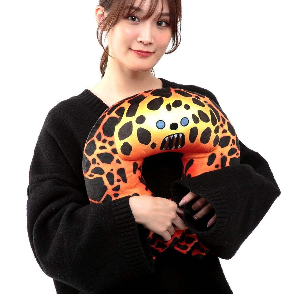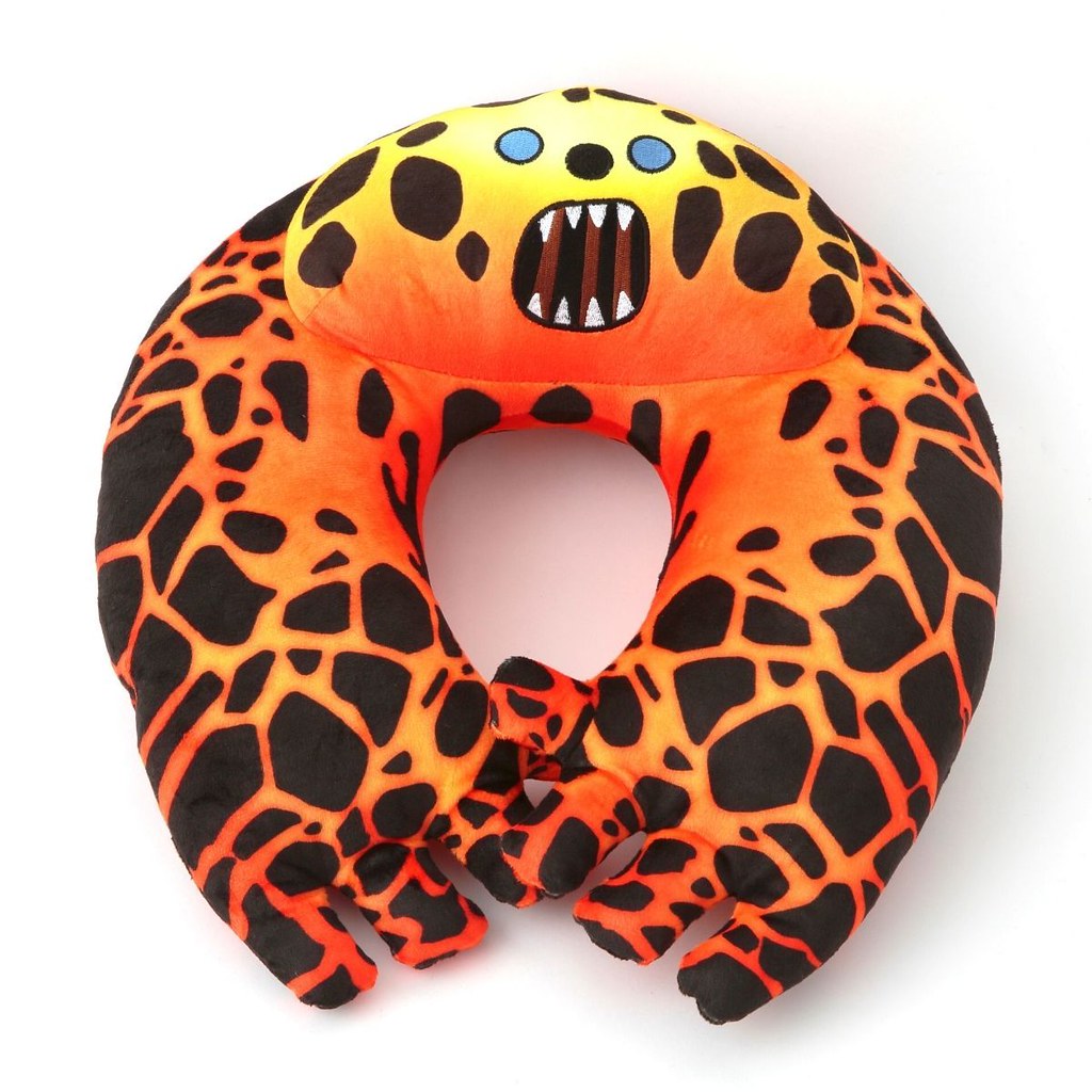 這次的「熔岩魔神頸枕」採用聚酯纖維製作,尺寸為長 38 × 寬 36 × 高 13 公分,完美地(?)將熔岩魔神的造型特徵、登場狀態與頸枕做結合,再現了熔岩魔神以岩漿、石塊構成的橘紅色身體,以及看似兇狠但其實很可愛的圓形眼睛,尾端還做出手指可以讓你拉著玩,整個是意外地萌翻人呀!