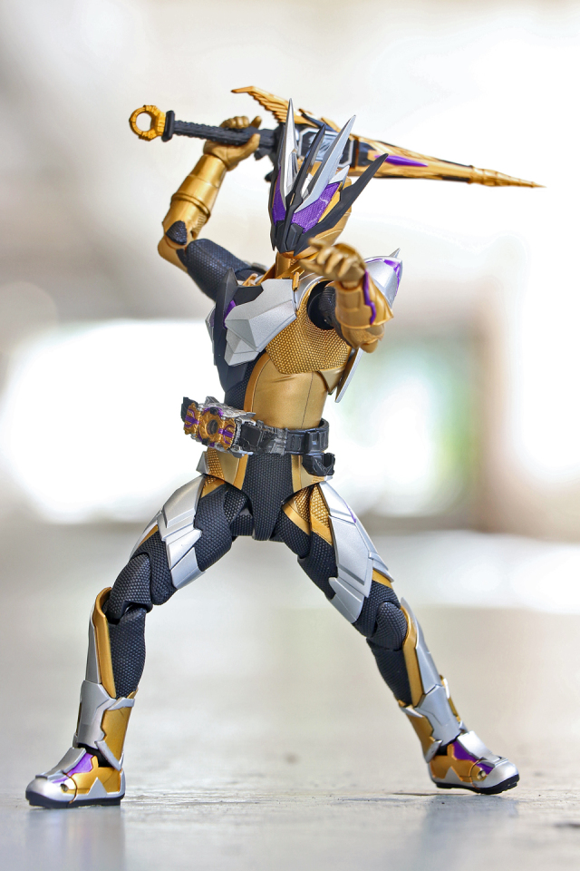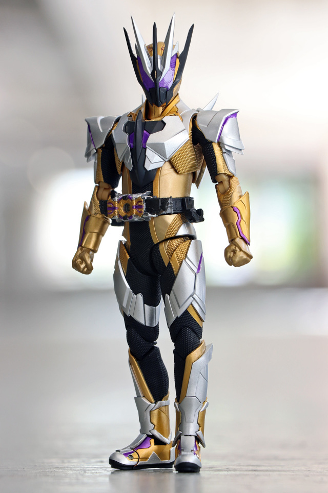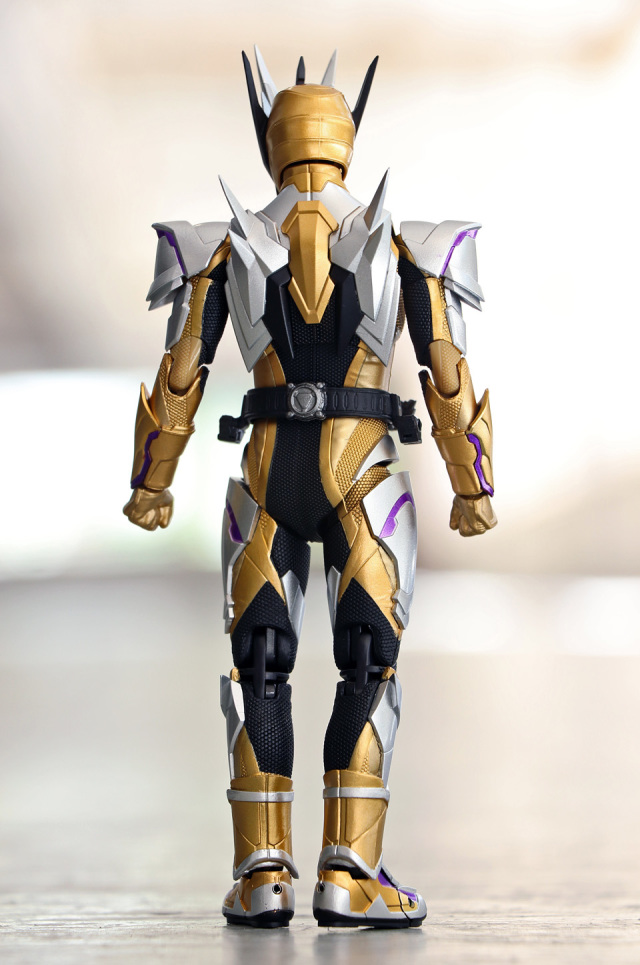 好!談回玩具吧!全高約 15 cm。配件包括替換用手掌左 4 種、右 3 種、拉出式劍拉柄、專用武器「ThousandJacker」、「Raidriser」及「Raidriser用右手掌零件」等。配件量不少,相比其他同系列幪面超人可玩性算不俗了!亦因為他的設計討好,所以 SHF 只要忠實地將他表達出來就不會太差了!主體的金、黑、銀、紫色配搭感覺新鮮。頭部的五根天線與邪氣的紫色複眼細節等設定 1000% 地還原,金色的華麗外裝、皮套紋路等造型及盔甲的細節分色等亦非常出色。「Raidriser」 及 千之驅動器也同樣具備細緻的造型,故外型上很難扣分。