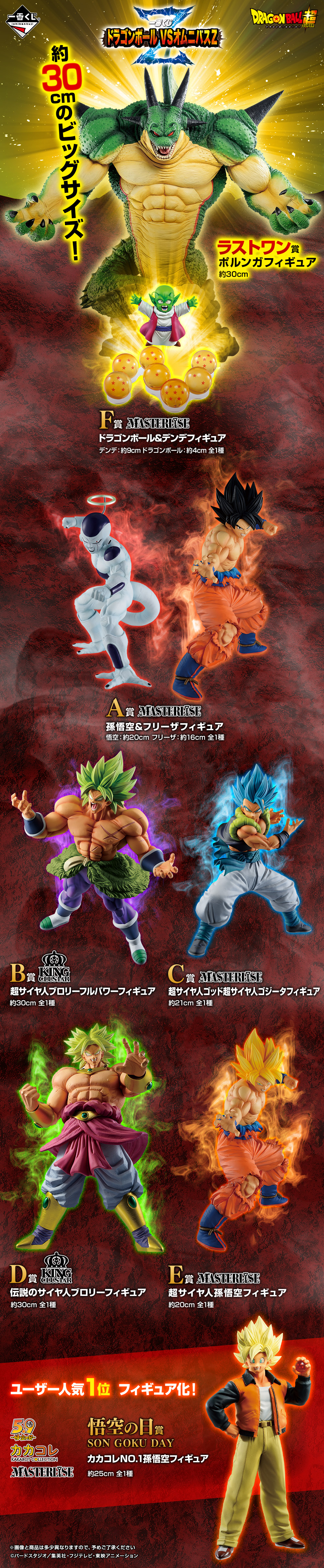 此次再度以經典的多人選集(オムニバス)對戰組合為設計,推出 11 個不同級別的賞品,目前公開了四組對戰組合,每款都是造型極為精緻的「MASTERLISE」系列模型,細膩再現壯碩的肌肉線條和服裝紋路。分別是A賞的「悟空 & 弗利沙」、B賞的「超級賽亞人布羅利究極全力型態」vs. C賞的「超級賽亞人之神之超級賽亞人 悟吉塔」; D賞「傳說的超級賽亞人布羅利」vs. E賞「超級賽亞人 悟空」; F賞則是可以念出召喚神龍密語的「龍珠&丹丹」和尺寸約 30 公分的超魄力最後一賞「波倫加神龍 軟膠模型」!另外,悟空日票選NO.1 的悟空之日賞便服造型卡卡洛特NO.1 悟空,也在本次一番賞亮相~