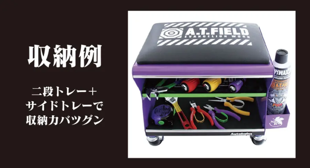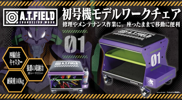 《新世紀福音戰士》官方商店「EVANGELION STORE」以的時尚工業用具主題品牌「A.T.FIELD EVANGELION WORK」( ワークブランド A.T.FIELD ) ,繼先前的「DC18V 充電式 1/2DR 衝擊扳手組合」與「初號機 手提式行動電源」後,推出了「初號機工作椅」,持續推出機工器具相關的商品。售價為 12,100 日圓,目前已於 EVA STORE 線上商城開放訂購。