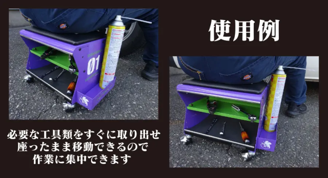 這次推出的「初號機工作椅」,以從事工作時需要移動的滾輪椅為設計,強大的鋼製椅身可以耐重約 140 公斤,搭配機能性十足的收納功能,當你在從事作業時可以輕鬆放置使用的器材。椅子下方有兩層的收納空間,連椅子旁都還有一個小盒子放置器材。