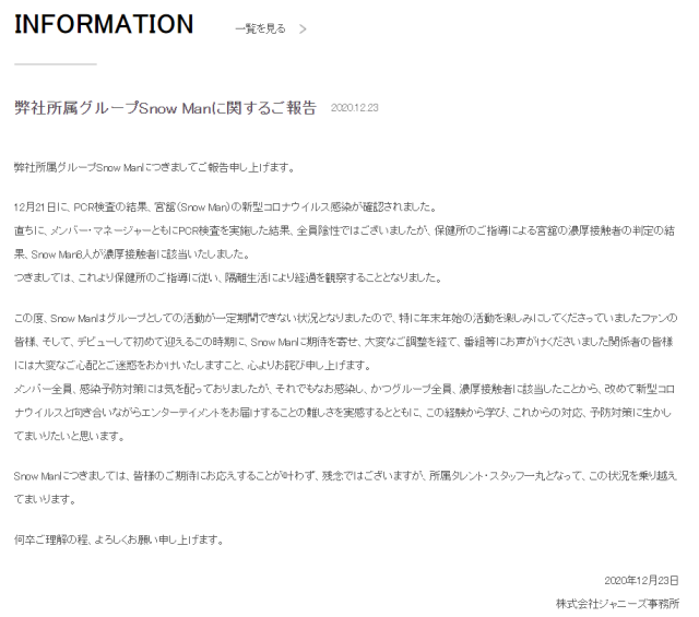 據傑尼斯事務所所發出的公告消息提及了因宮館涼太採檢結果確定為陰性,因此事務所官方除了決定為Snow Man的八位成員進行隔離措施外,同時也將宣布短期內將暫停任何演藝活動,來確保團員的身體健康。