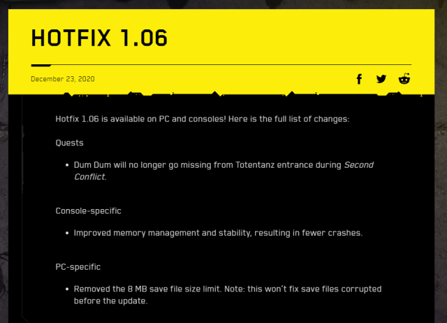 而今日《電馭叛客2077》官網也在今日公告,已經在各大平台上發布了最新修正檔1.06版本,解決了先前所提的PC版8MB以上會造成存檔損害的問題外,同時在遊戲主機記憶體上也有所改善,減少閃退問題。