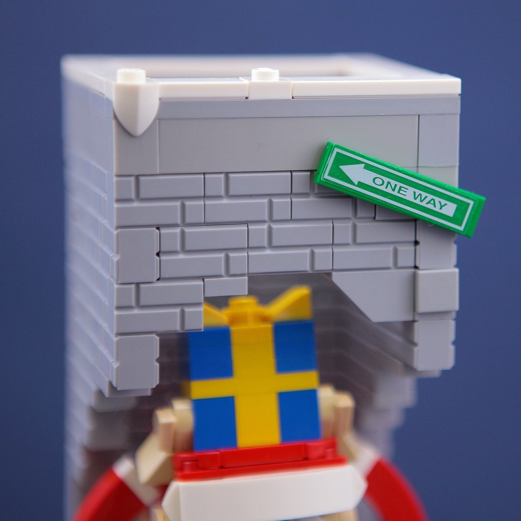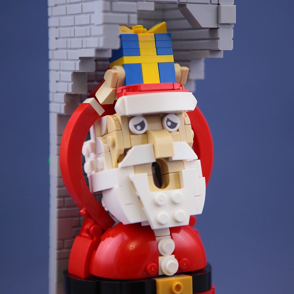 本次的作品圍繞著「聖誕老人會從煙囪爬進家裡送禮物」的主題設計,但是注入了一個十分活潑有趣的元素:因為肚子太大撐破煙囪!聖誕老公公本體從肥胖的身形到無奈的表情都有細緻的刻畫,白花花的落腮鬍十分傳神,拿著禮物的雙臂、圓滾滾的肚子用上弧形件、平板磚仔細地勾勒出線條,可以拿來當作迷你城堡的沙色磚上下合併就變成了一個彷彿正喊出「Ohhhh~」的嘴型,再加上眼角下垂的眼睛,超可愛!