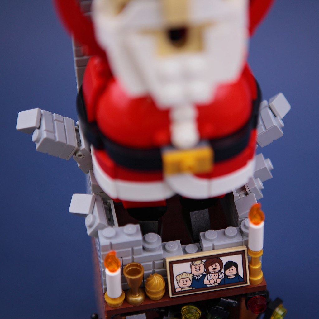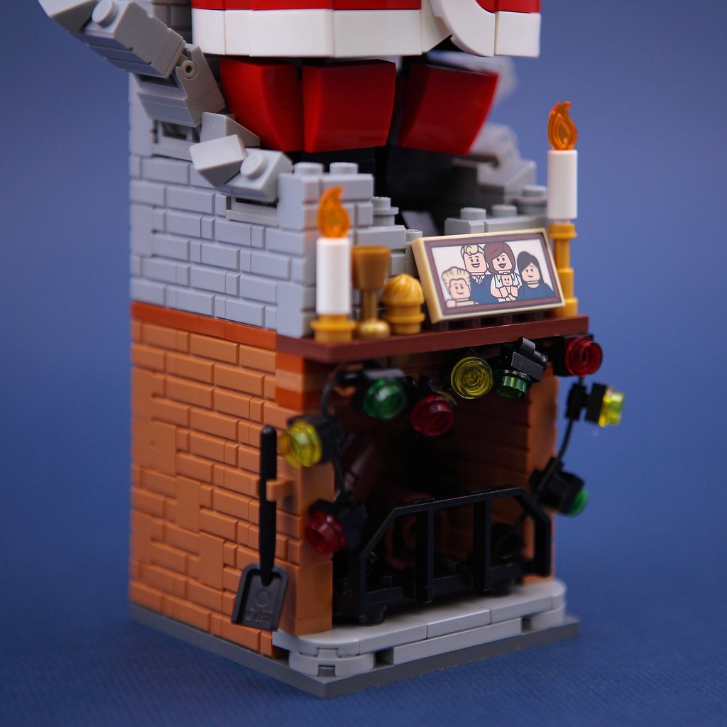 壞掉的煙囪,兩側利用可調整角度的零件營造出煙囪破裂、磚塊噴飛的瞬間,火爐的部分也做出了上方的燭台、掛在一旁的鏟子、全家福照片,以及掛上去的聖誕燈這些細節;整體大概用上了 450 片零件左右,小編覺得最有趣的就是那對細細長長的手臂,平常可能都是拿來修飾載具或機甲的線條,這樣呈現真的好讚!