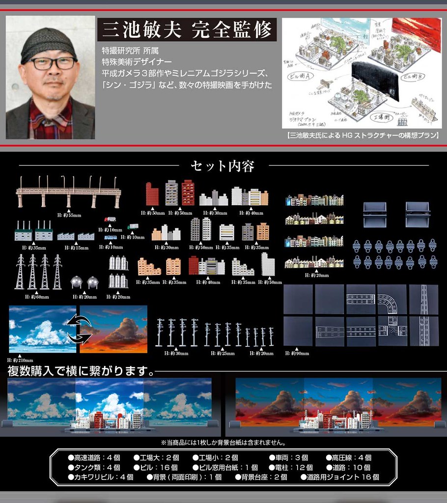 喜歡特攝劇集、收藏 HG 系列轉蛋的玩具人一定不能錯過~此次 GASHAPON 推出的「HG STRUCTURE」建築場景套組,將特攝片的建築場景以縮小比例重現,由電影《平成哥吉拉》三部曲的美術指導-三池敏夫 完全監修,精緻再現包含高速公路、高壓塔、工廠、建築物、電線桿、儲罐與街道、車輛、陰晴天空的背景等微縮場景,結合 「卡美拉 壹」等HG系列轉蛋,就可以拍攝出迷你的特攝場景!小小的轉蛋瞬間變成宛如劇中的大怪獸~