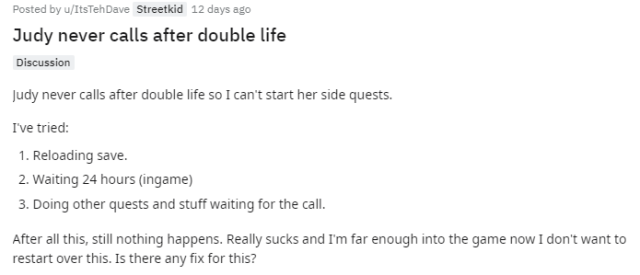但沒想到主線任務也過了,重新讀檔、等了24小時(遊戲內的時間),甚至在等待期間解了其他支線,就是遲遲等不到茱蒂的來電,觸發支線劇情,但沒想到依舊沒有得到任何反應,這讓這名玩家因為解不到茱蒂支線,果斷放棄了《電馭叛客2077》這款遊戲。