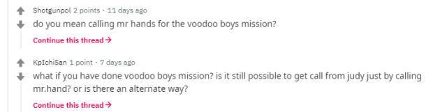 或許真的是因為Bug,又或者是該名玩家沒有解到應該解的主線任務,但其實在主線第二章「不由自主」後,必須要解決巫毒仔的主線任務後的大約兩三天時間(遊戲時間),才會等到茱蒂的支線任務。