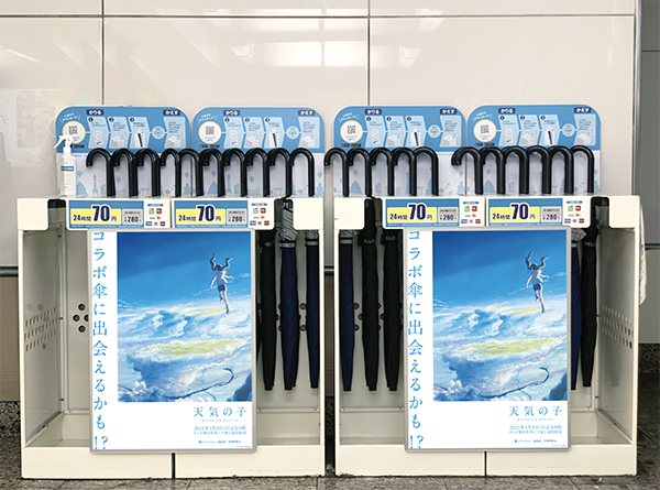 日本也有這樣的服務,最近為了紀念動畫電影《天氣之子》將於 2021 年 1 月 3 日於朝日電視台播出,與租賃雨傘服務的 i-kasa 推出聯名的租用傘服務,目前將於 2020 年 12 月 29 日~2021 年 1 月 3 日開放租用,使用一次為 70 日圓。
