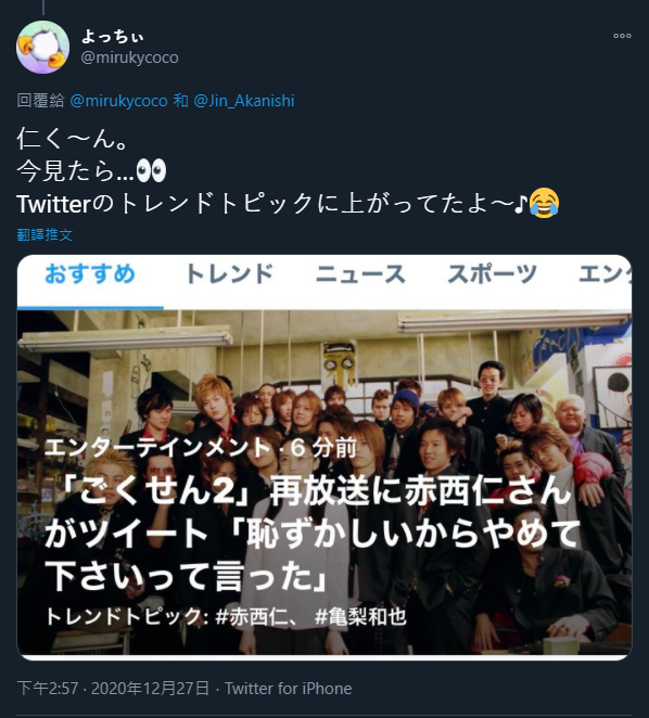 如今《極道鮮師2》在NTV的重播,不僅讓粉絲們極為喜悅,就連現年36歲的赤西仁也在他的個人推特上表示「超尷尬、超害羞的,拜託不要重播啦~」這樣的話,當然電視台官方也堅決表示「我們就是要重播」。