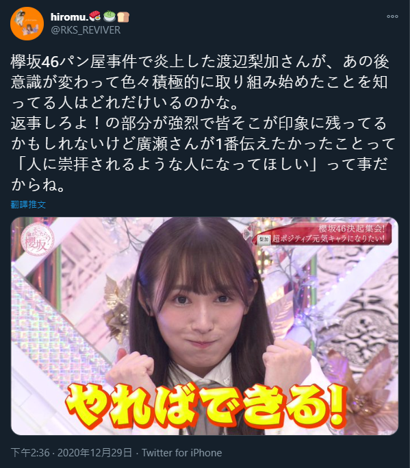 在還未改名成櫻坂46的「欅坂46」,兩位成員渡邊梨加與長澤菜菜香過去曾在自家節目《欅って、書けない?》第228集中,與日本麵包職人「廣瀨滿雄」先生學習,體驗製作麵包的工作。