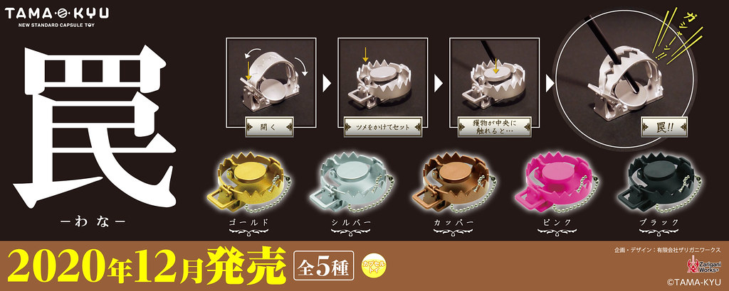 專門推出動漫相關周邊商品的 Bushiroad Creative (ブシロードクリエイティブ)公司,旗下新興的轉蛋品牌 TAMA-KYU(たまきゅう)又將推出趣味新作:捕獸夾「陷阱」(罠)吊飾轉蛋,一共有五種款式,一轉參考售價為 200 日圓,將於 2020 年 12 月下旬開轉!