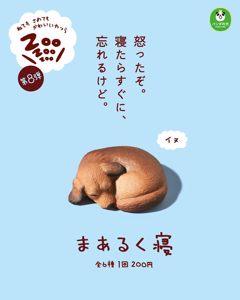 日本TAKARA TOMY 玩具公司的轉蛋品牌熊貓之穴(パンダの穴),旗下大人氣的長壽轉蛋「睡眠動物園」(ZooZooZoo)」系列商品,在推出「躺著睡的第一彈」、「趴著睡的第二彈」、「坐著睡的第三彈」、「無憂無慮睡的第四彈」、「垂頭睡的第五彈」以及「矇眼睡的第六彈」、「沒幹勁的第七彈」之後,又將推出第八彈新作:まあるく寝啦!一共有六種款式,參考售價為一轉200日圓,預計將於2020年12月下旬開轉~