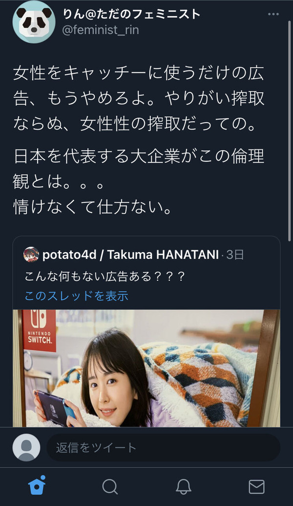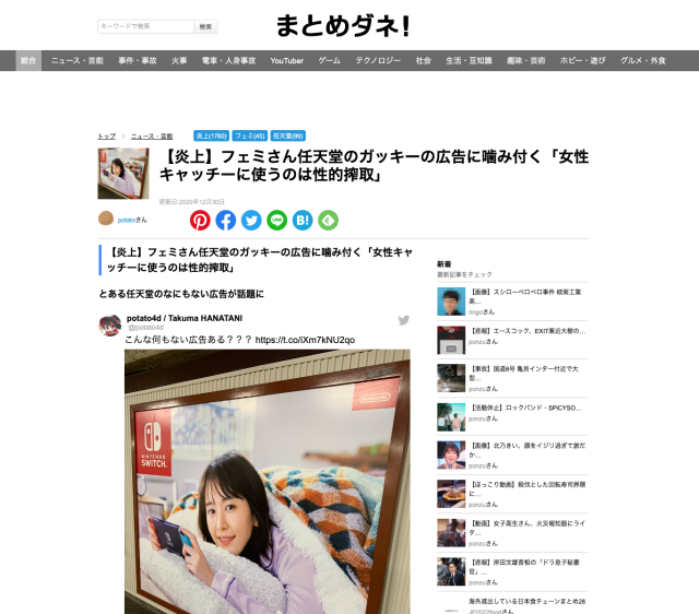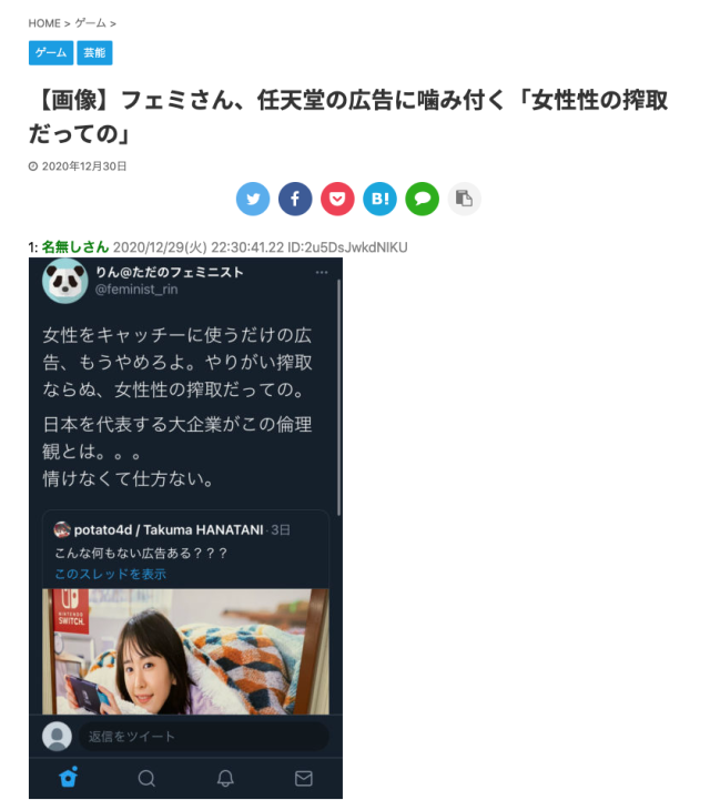 任天堂許多《Nintendo Switch》廣告以主打清新形象的新垣結衣為主角,例如在「健身環」中成功建立起「居家電玩也能運動」的健康形象,無論是「打地鼠篇」、「居家冒險篇」、「對決篇」等播出都有空前絕後的迴響,而這次「任天堂 Switch 2020冬季廣告TVCM」卻遭到日本網友批判,自推特中一個推行「女性主義者rin」帳戶中表示「只能依靠賣弄女性賺取人氣的廣告別再搞了,這是完全無意義的剝削,是對女性的『性榨取』,同時也佐證了大公司倫理觀可悲。」引發網友熱議。