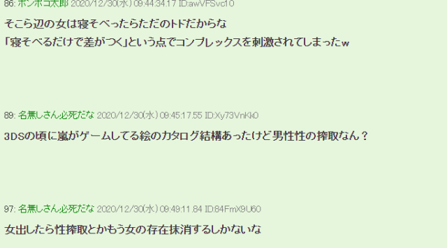 例如:「在3DS時代也有以嵐做為宣傳的廣告,那難道也是男性剝削嗎?」、「以這個邏輯來看有女性存在都是剝削」、「這個廣告是因為主打男性課群」、「所以要禁止女性上電視嗎?」、「我覺得女權主義者總能在任何地方抓到靈感」、「或許只剩下伊斯蘭教能貼合這種價值觀」。